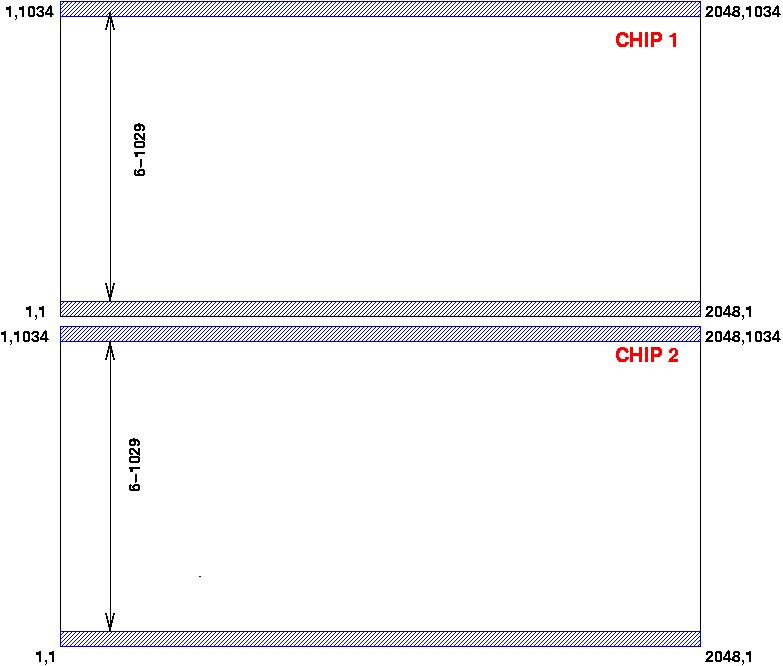 Two pre/overscan regions were present in the CCD. For the standard CCD format (1x1 binning), these regions were 16 pixels wide (i.e. columns 1...16 for the prescan and 2065...2080 for the overscan). For a graphical description of the detector sections, have a look here (pre-view) or here (ps file). Note that for presentation reason, the pre-scan regions have been artificially enlarged. |