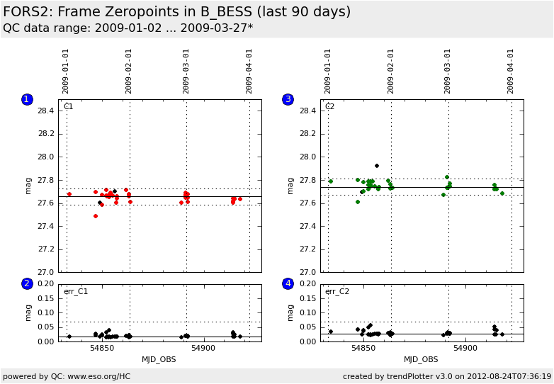 If applicable, the latest values from Paranal ops logs are plotted as blue dots. More information about those values, including a download option, is available in the OPS column.