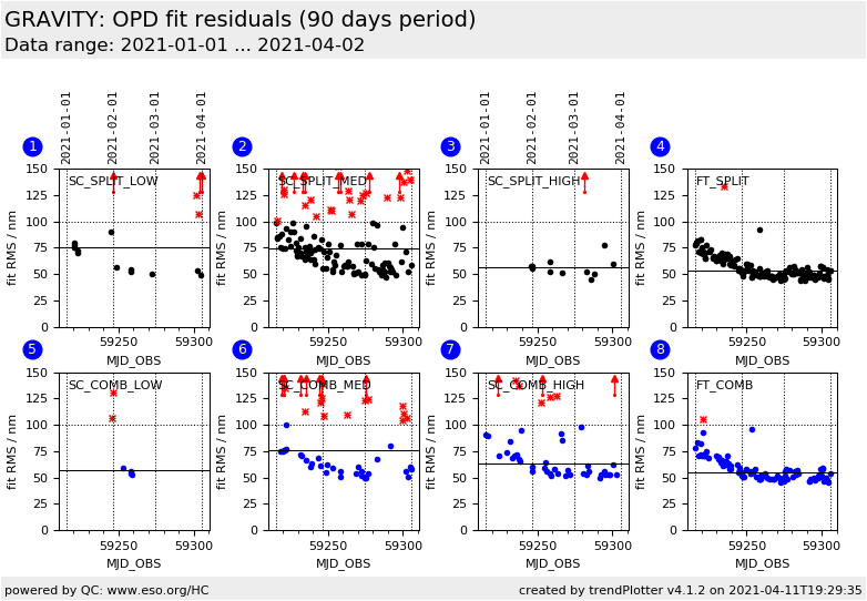 RMS of fit to metrology, Fringe Tracker (FT) detector, SPLIT polarisation |