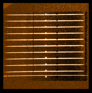 [std.gif 10K] A combination of 11 stellar raw spectra and the 11 star images subtracted, to demonstrate the Y-shift of the spectrum versus the target position in imaging. The MR grating is used.