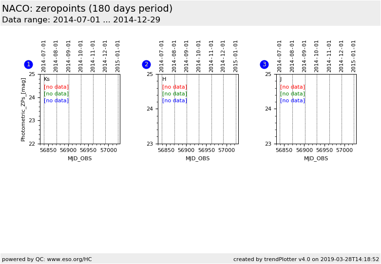 Photometric Zeropoints (not corrected for extinction) are shown for three broad band filters Ks, H and J. They are derived from the standard star observations taken in camera S13, S27 and S54 and the VIS dichroic.