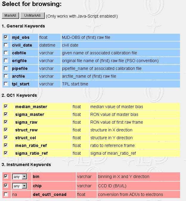 Section 1-3: General, QC1 and instrument keywords can be selected. The default selection is based on the most relevant numerical (integer or real) keywords. Some or all of the Instrument Keywords can be used for filtering the output. Default setting is always 'any'. The string 'na' shows up for those keys which cannot be used for filtering. Selection can be reset. A Markall/UnMarkAll option is offered on top.