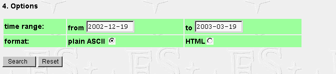 Section 4: The time range for data selection can be specified. Default values are: from [today minus 3 months] to [today]. Output format options are 'ASCII' (with a headline and unformatted output, preferred for machine processing of the output), and 'HTML' which includes formatting. The HTML option should be avoided in case of larger data sets (more than 300 or so lines) since the HTML tag overhead becomes significant then.