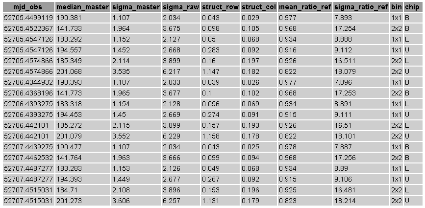 This interface allows to browse the complete, selected or filtered content of a chosen table. The selected options are transformed into a database query. The example below can be verified by chosing 'uves' and 'uves_bias' in the general interface.