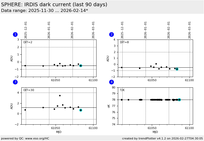 This plot shows the IRDIS detector dark level values of the three regularly acquired health check
