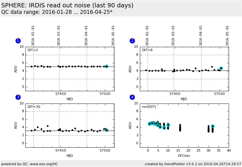 This plot shows the IRDIS readout noise (RON) values extracted from from dark exposures of the three regularly acquired