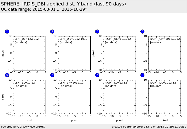This plot shows the pixel shift introduced by the IRDIS optical distortion. The left four boxes are for the left beam and the right four boxes are for the right beam.