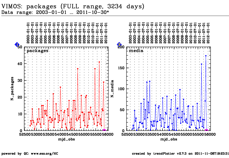 These plots visualize the monthly number of SM/VM data packages and media (DVDs) created
