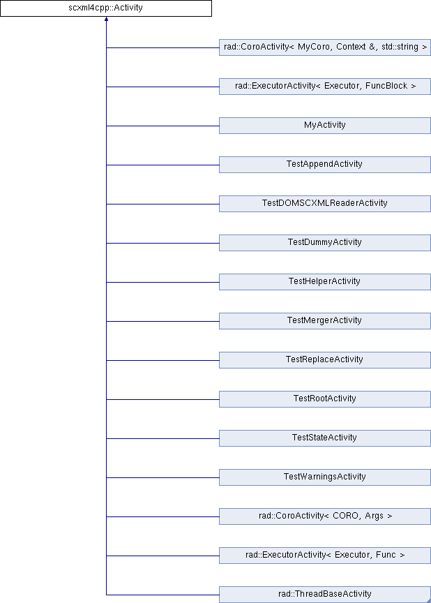 Implemented in rad::ExecutorActivity< Executor, Func >, rad::ExecutorActivity< Executor, FuncBlock >, rad::CoroActivity< CORO, Args >, rad::CoroActivity< MyCoro, Context &, std::string >, rad::ThreadBaseActivity, TestWarningsActivity, TestRootActivity, TestReplaceActivity, TestDOMSCXMLReaderActivity, TestAppendActivity, TestStateActivity, TestMergerActivity, TestHelperActivity, MyActivity, and TestDummyActivity.