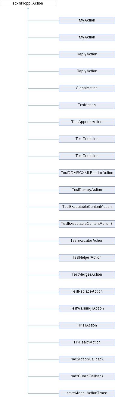 Implemented in scxml4cpp::ActionTrace, rad::ActionCallback, MyAction, SignalAction, TestDummyAction, ReplyAction, ReplyAction, TimerAction, TrsHealthAction, MyAction, TestExecutableContentAction, TestExecutableContentAction2, TestExecutorAction, TestHelperAction, TestMergerAction, TestCondition, TestAction, TestCondition, TestAppendAction, TestDOMSCXMLReaderAction, TestReplaceAction, TestWarningsAction, and rad::GuardCallback.