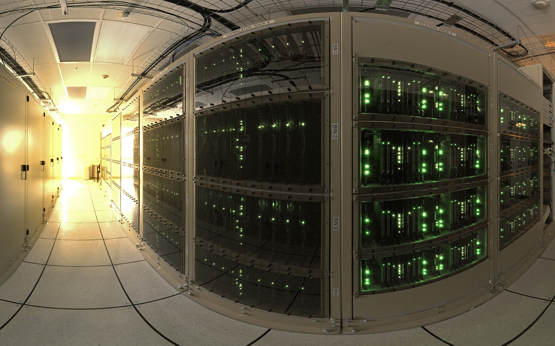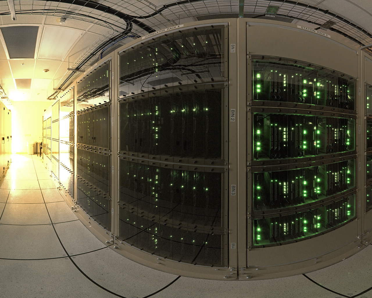 Hoch oben in den abgelegenen Anden im Norden Chiles wurde mit dem ALMA-Korrelator einer der leistungsstärksten Supercomputer der Welt errichtet und erfolgreich getestet. Diese Weitwinkelaufnahme zeigt einige der Schaltschränke des Korrelators im technischen Betriebsgebäude an der ALMA Array Operations Site. Das Bild zeigt eine von vier Einheiten des Korrelators. Das Gesamtsystem besteht aus vier identischen Einheiten mit mehr als 134 Millionen Prozessoren, die bis zu 17 Billiarden Rechenoperationen pro Sekunde durchführen können.