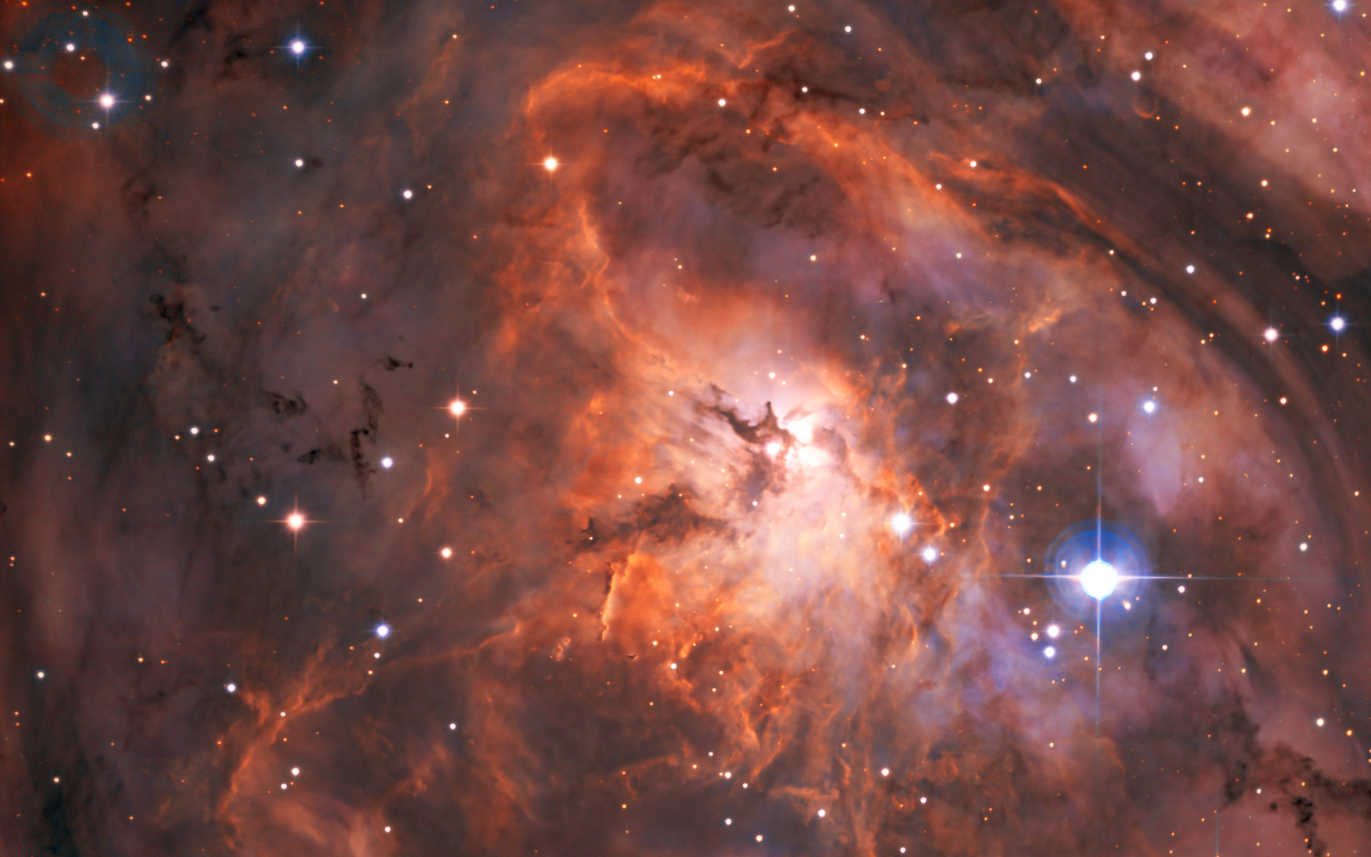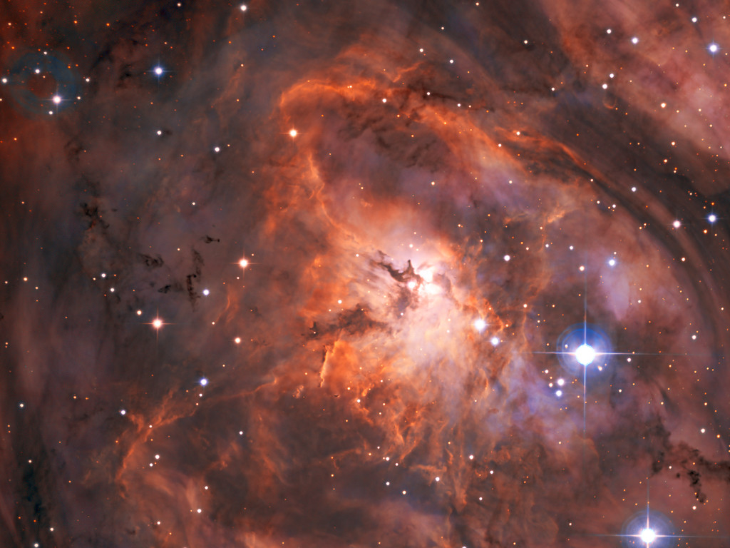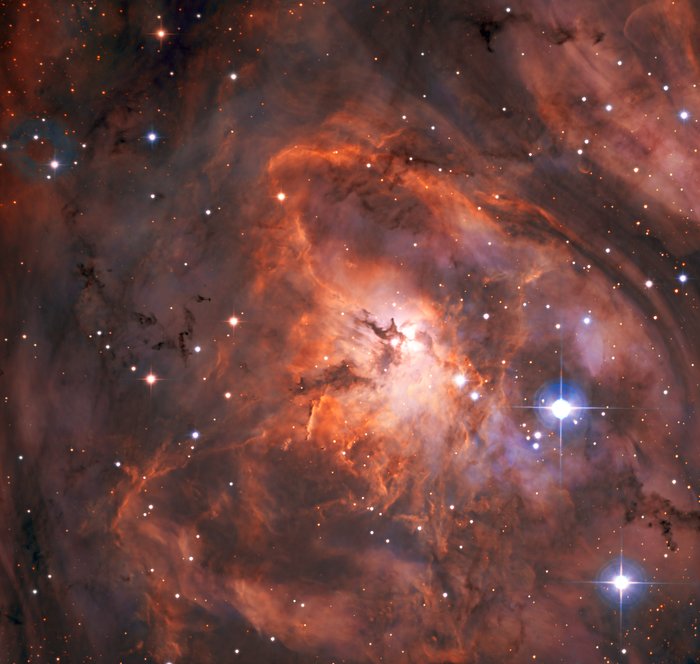 Stellen Sie sich vor, Sie hätten ein brandneues, hochmodernes Teleskop. Was würden Sie als erstes damit anschauen? Die Forscher am SPECULOOS Southern Observatory, das aus vier kleineren Teleskopen mit je einem Meter Durchmesser besteht, haben sich für den Lagunennebel entschieden. Dieses herrliche Bild ist das Ergebnis und stellt eine der ersten Beobachtungen von SPECULOOS dar. Der Nebel ist eine Wolke aus Staub und Gas innerhalb unserer Galaxie – ein Ort, an dem neue Sterne geboren werden und der etwa 5000 Lichtjahre von uns entfernt ist.