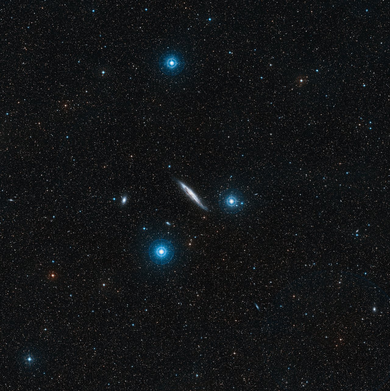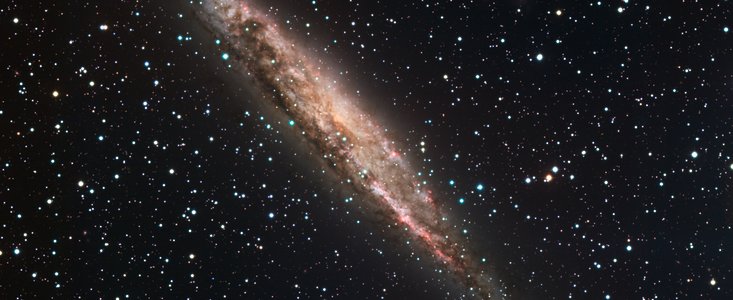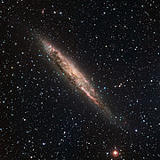 Die neue Aufnahme von NGC 4945 wurde mit dem Wide Field Imager (WFI) erstellt, einer astronomischen Kamera mit besonders großem Blickfeld am 2,2-Meter MPG/ESO-Teleskop des La Silla-Observatoriums in Chile. Von der Erde aus gesehen erscheint NGC 4945 zigarrenförmig. Tatsächlich handelt es sich um eine Scheibe, die im Vergleich zu ihrem Durchmesser relativ dünn ist; zigarrenförmig erscheint sie uns, weil wir sie von der Seite sehen. In der Scheibenebene winden sich Spiralarme aus Sternen und leuchtendem Gas. Mit Hilfe spezieller optischer Filter, mit denen sich das Licht heißer Gase wie beispielsweise Wasserstoff gezielt aufnehmen lässt, lassen sich in NGC 4945 Regionen sichtbar machen, in denen neue Sterne entstehen.
