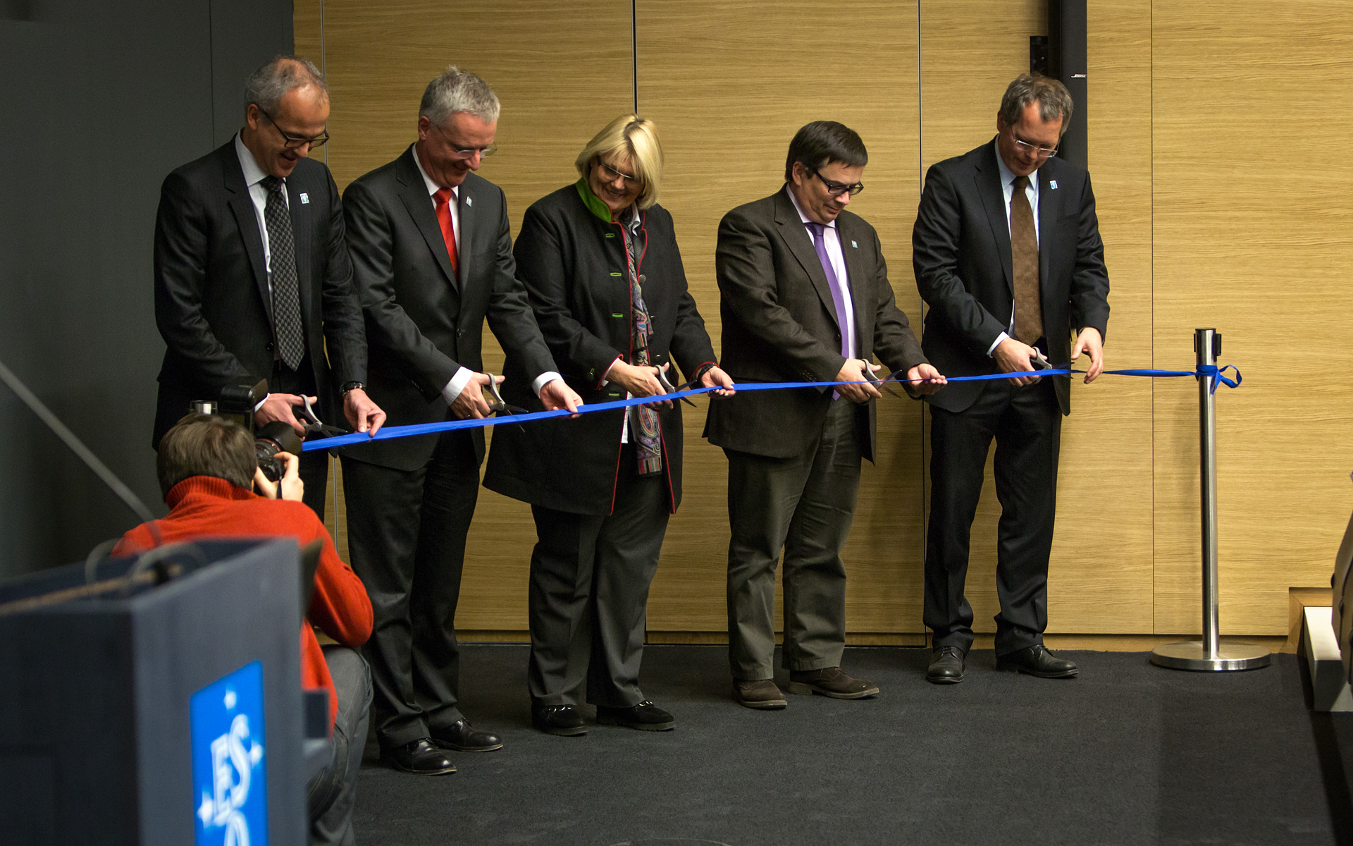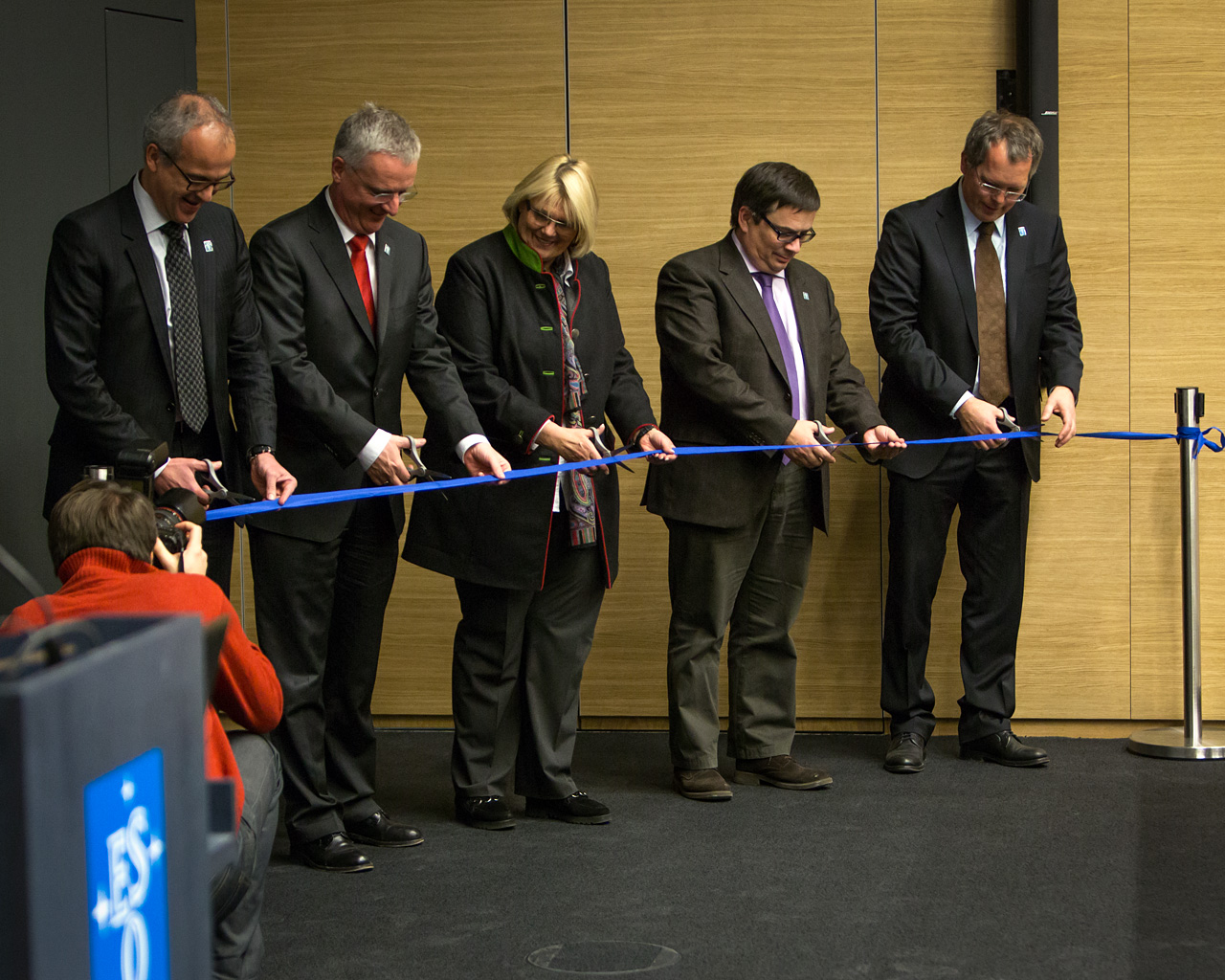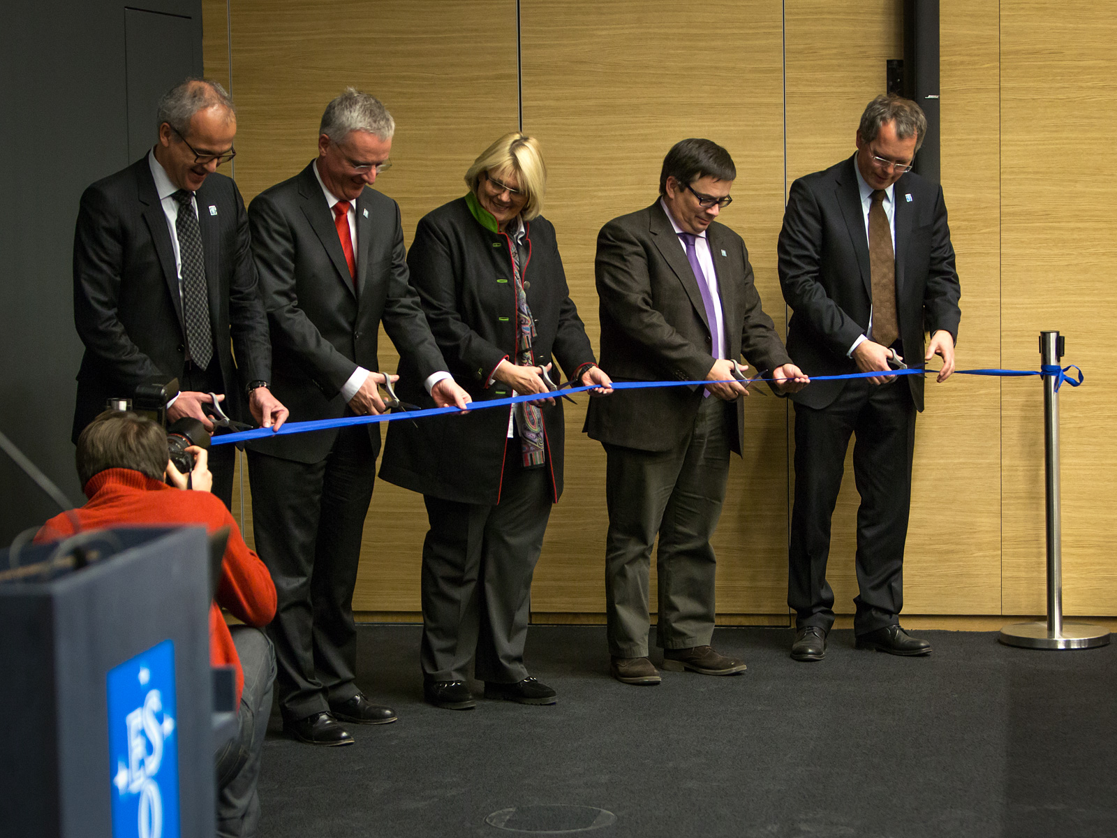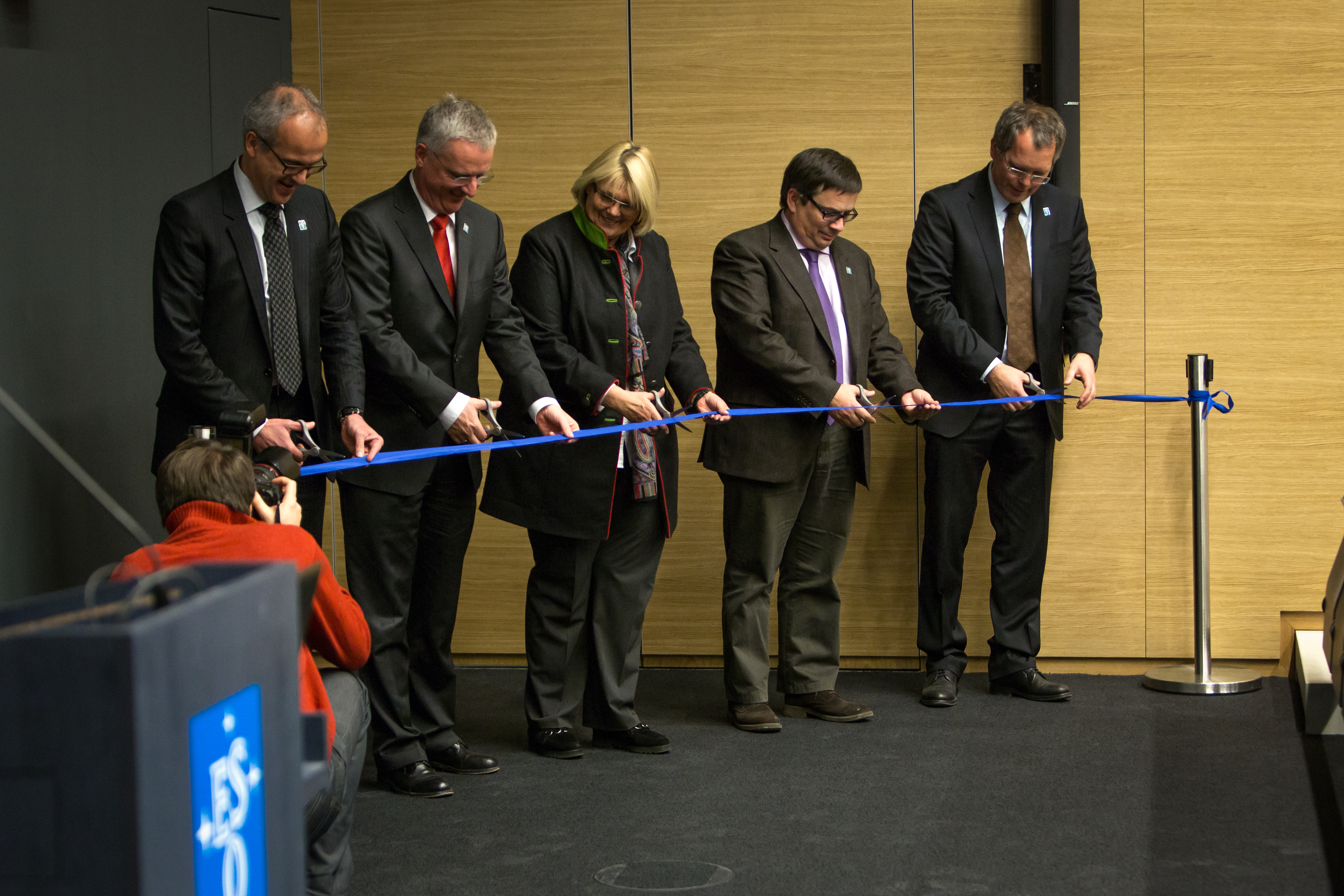 Feierliches Durchschneiden des Bandes zur Eröffnung der Erweiterung des ESO-Hauptsitzes am 4. Dezember 2013. das Foto zeigt von links nach rechts: ESO-Verwaltungsleiter Patrick Geeraert, ESO-Generaldirektor Tim de Zeeuw, die Garchinger Bürgermeisterin Hannelore Gabor, Xavier Barcons, der Präsident des ESO-Council und Christoph Haupt, der Projektmanager der ESO-Hauptsitzerweiterung.