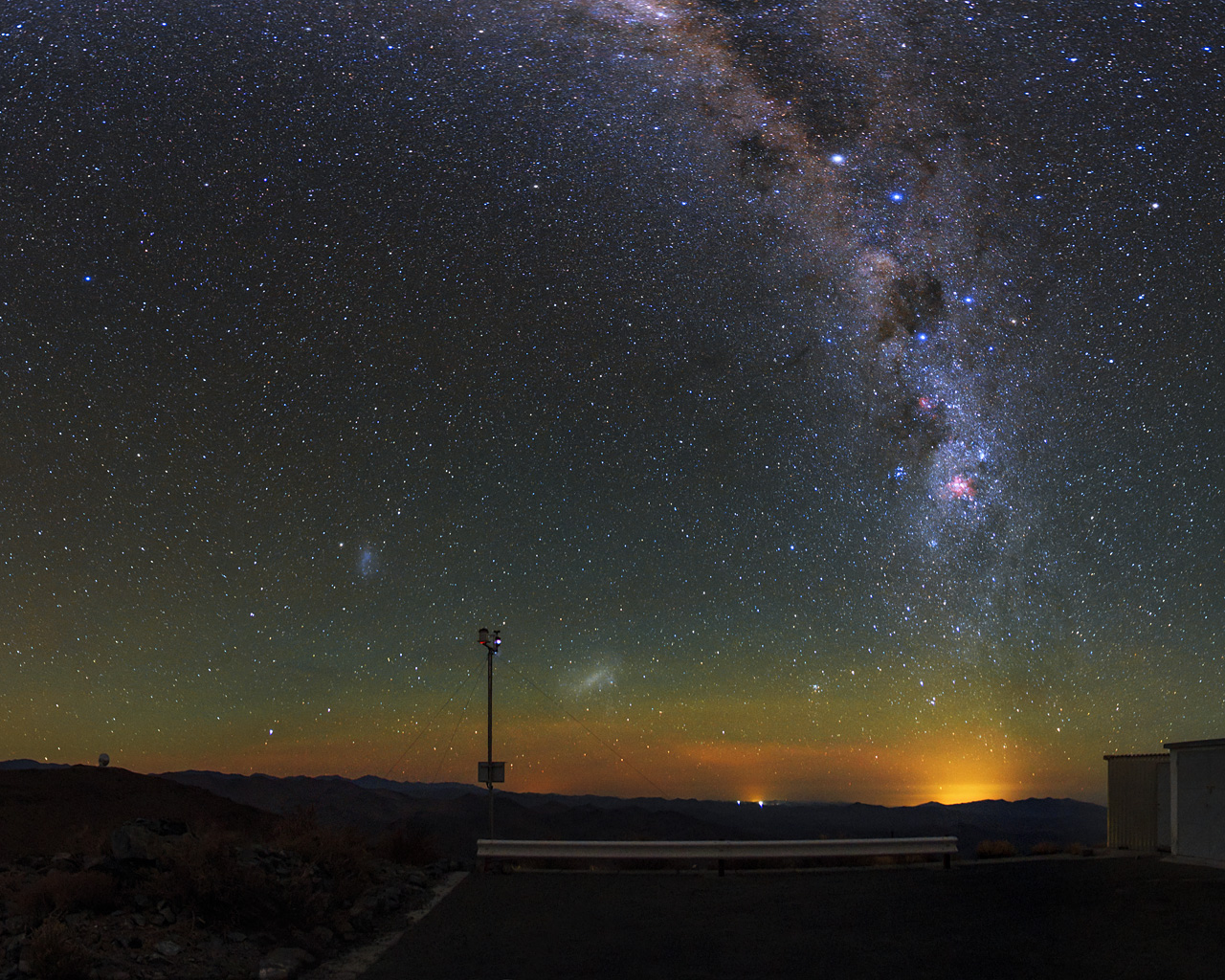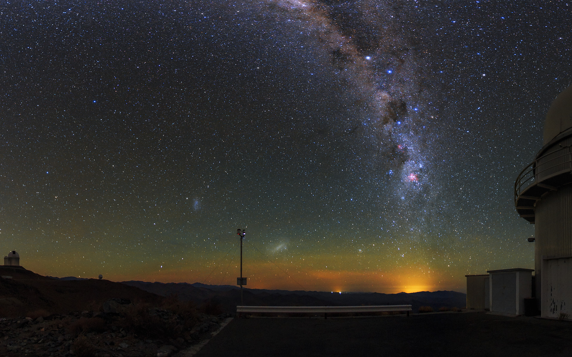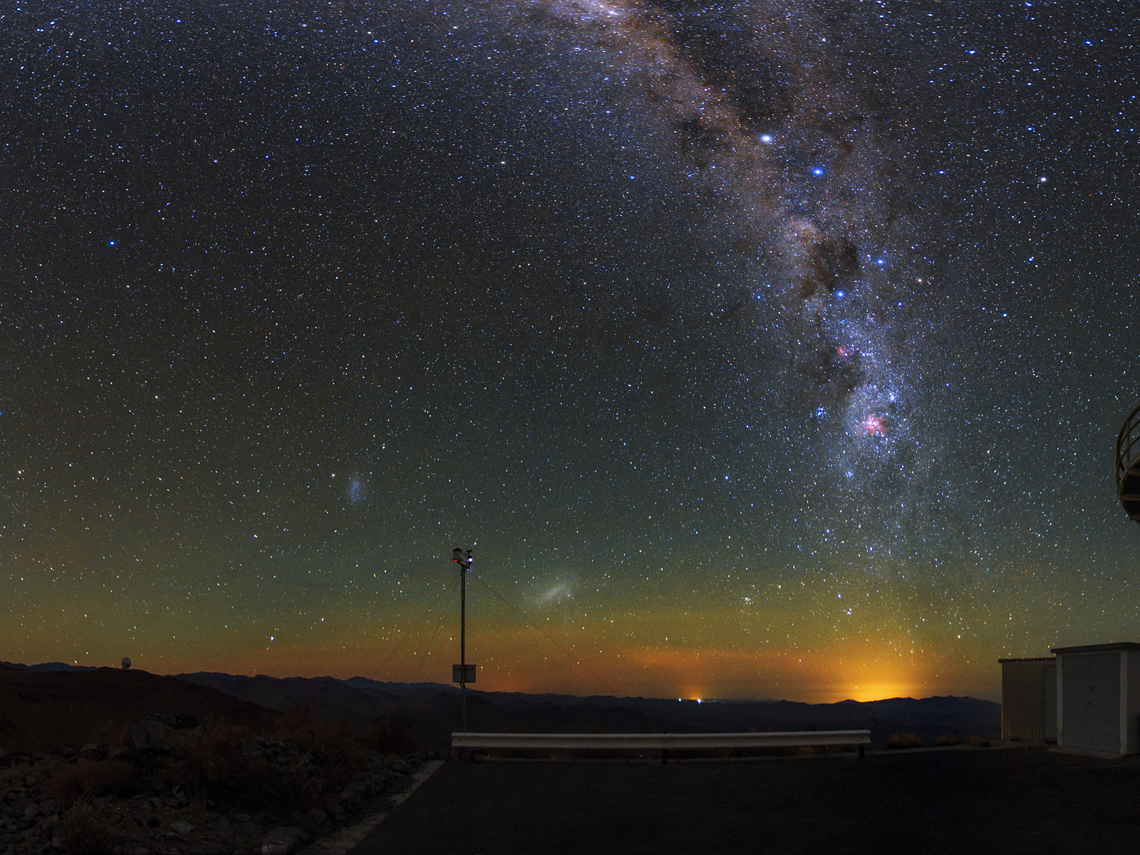 Zwei der auffälligsten Lichtquellen in diesem grandiosen Foto sind die Große und Kleine Magellansche Wolke, die man als zwei diffuse Fleckchen in der Nähe der Bildmitte erkennt. Diese zwei Galaxien sind 160 000 bzw. 200 000 Lichtjahre von uns entfernt.