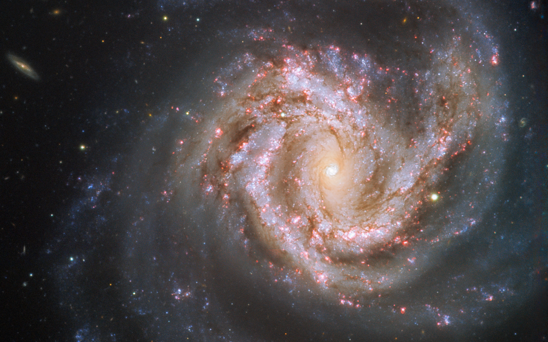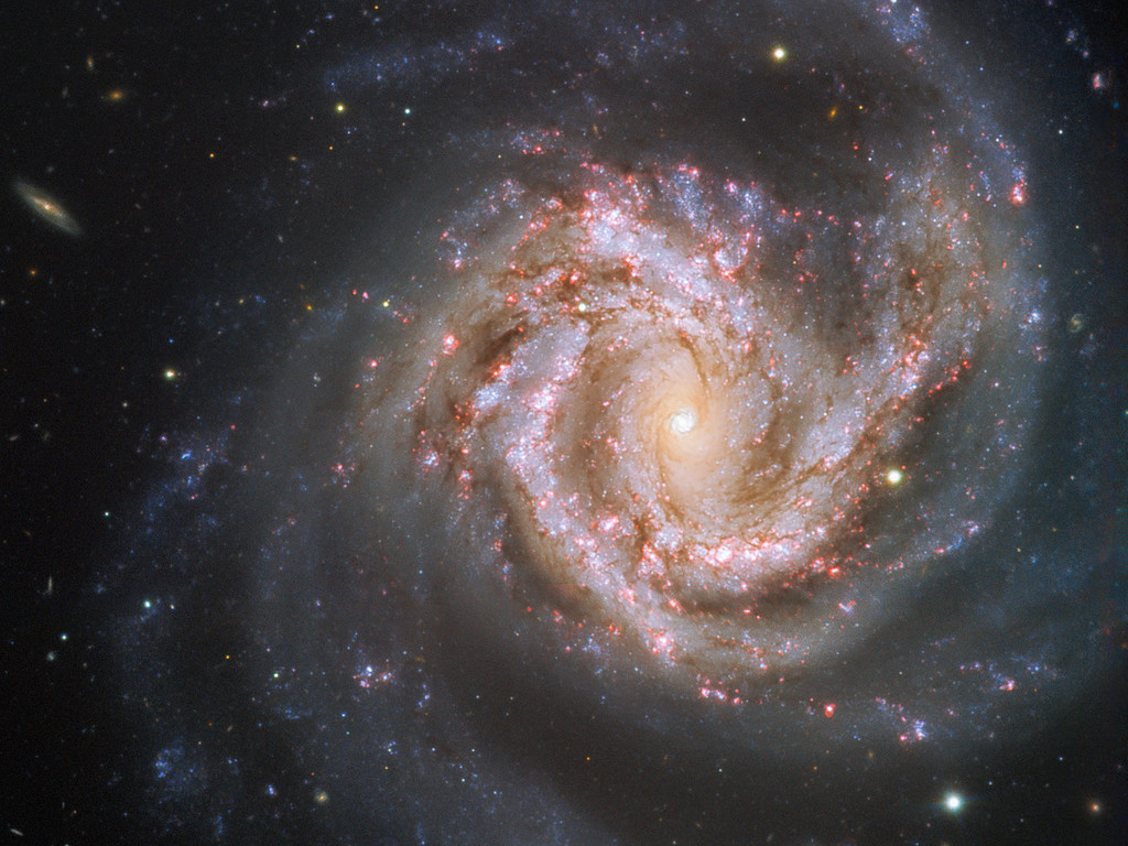 Messier 61 ist eines der größten Mitglieder des Virgo-Galaxienhaufens, der aus über tausend Galaxien besteht und das Zentrum des Virgo-Superhaufens bildet, zu dem auch unsere Milchstraße gehört. Diese atemberaubende Schönheit wurde 1779 entdeckt und hat die Astronomen seither in ihren Bann geschlagen. Vor einem Hintergrund gespickt mit anderen Galaxien erstrahlt M61 in voller Pracht – selbst aus einer Entfernung von über 50 Millionen Lichtjahren.