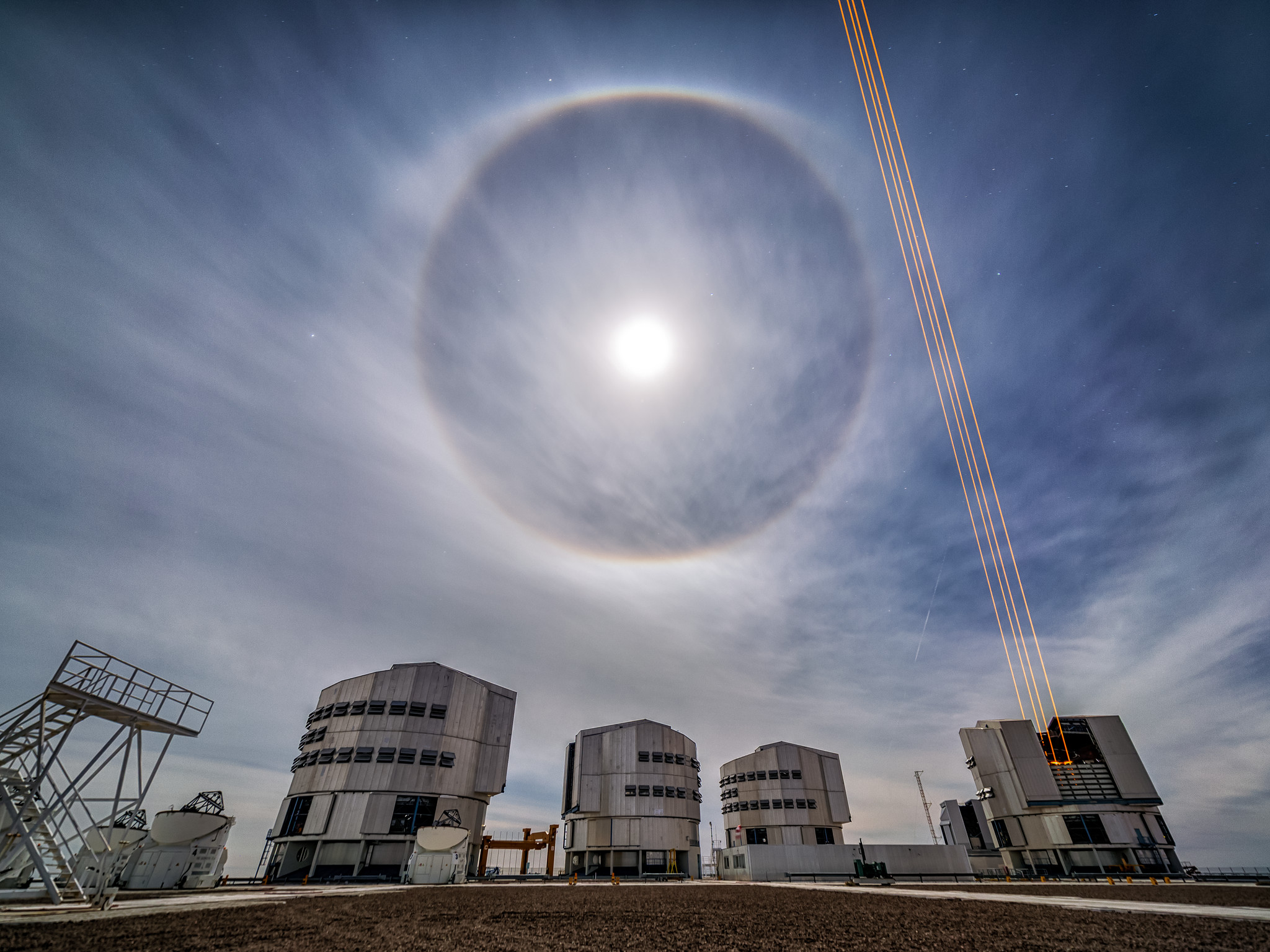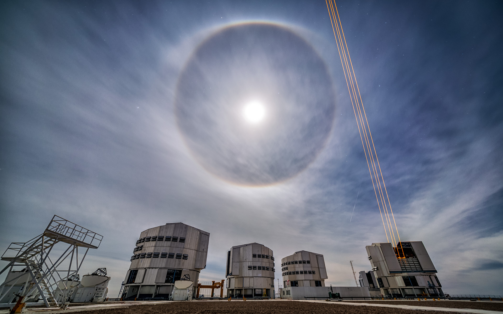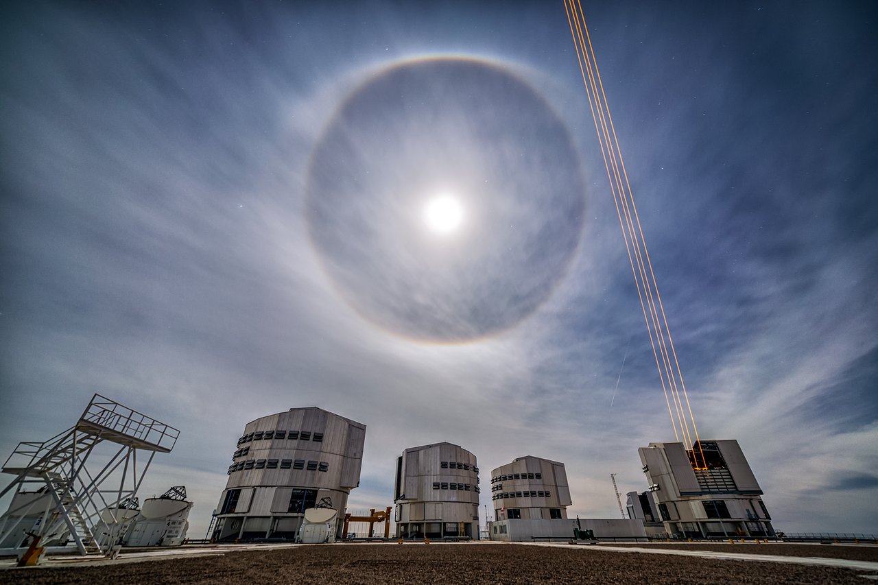 Die Fremdartigkeit dieses Bildes, das beim Very Large Telescope (VLT) der ESO im Norden Chiles aufgenommen wurde, rührt von der Kombination aus natürlichen und künstlichen Lichtphänomenen her. Der ätherische Charakter des Bildes wird durch den Mondhalo erzeugt, der an einem der seltenen bewölkten Tage am Paranal-Observatorium zu sehen war. Dieses optische Phänomen entsteht durch Lichtbrechung des Mondlichtes an Millionen kleiner Eiskristalle und Wassertröpfchen in der Atmosphäre.