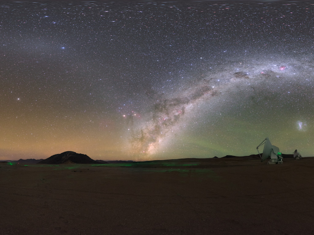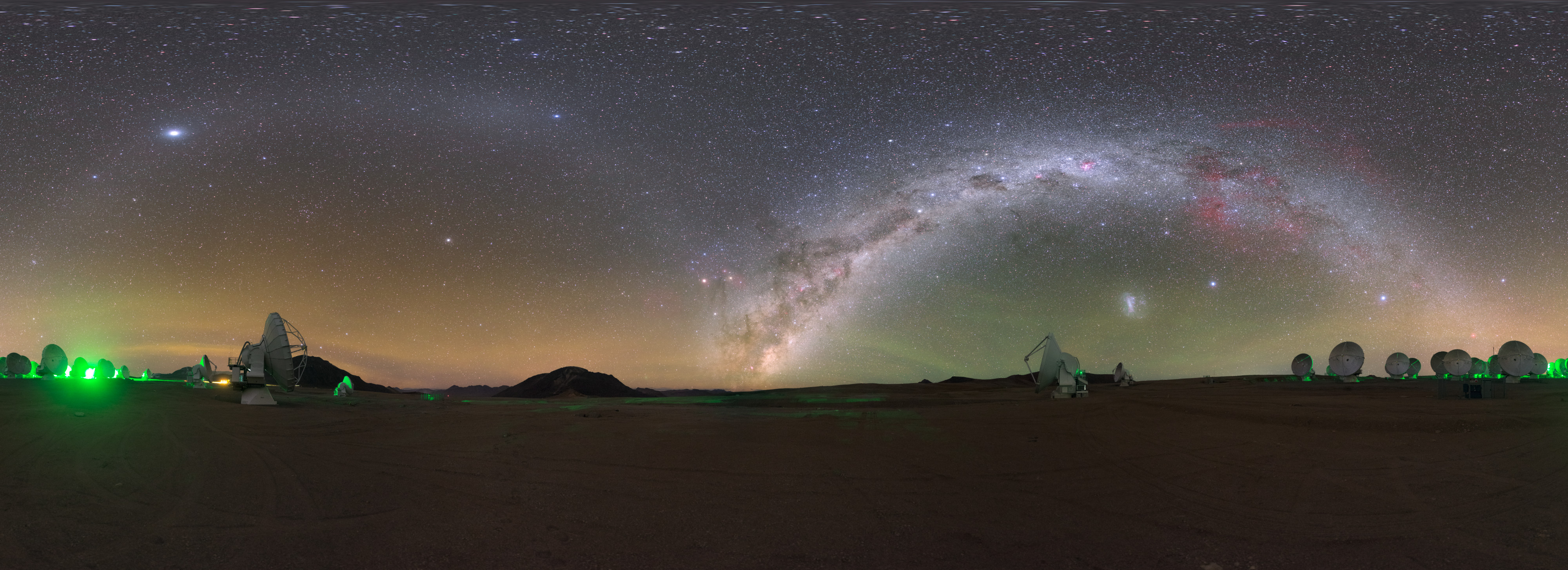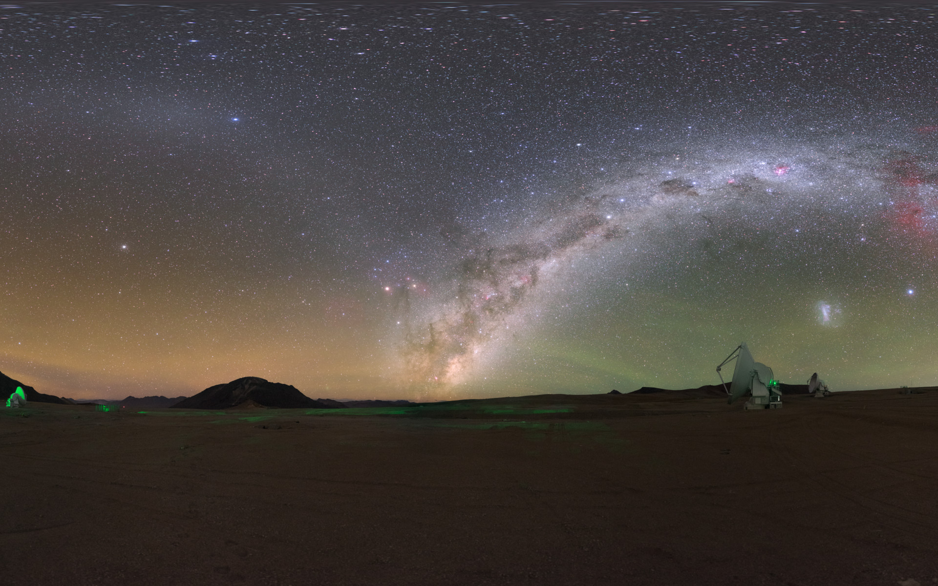 Dieses in Nordchile aufgenommene Bild zeigt zwei riesige Bögen am Himmel. Der rechte ist die Milchstraße, die prächtig über dem Atacama Large Millimeter/submillimeter Array (ALMA) erstrahlt, einem Observatorium, bei dem die ESO ein Partner ist. Doch trotz dieses atemberaubenden Anblicks sollten wir den linken Bogen aus Licht nicht außer Acht lassen.