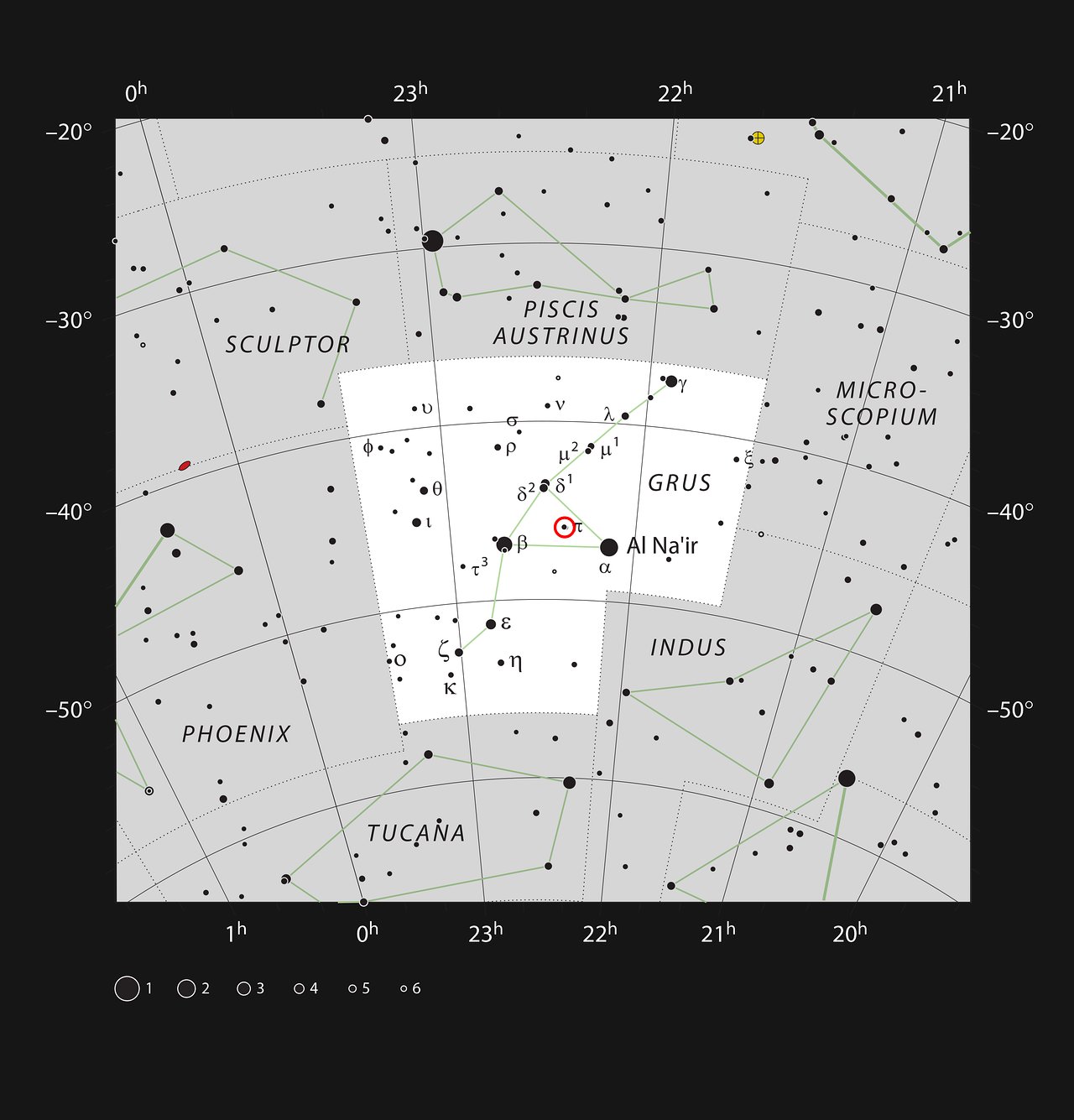 530 Lichtjahre von der Erde entfernt im Sternbild Kranich (lat. Grus) befindet sich π1 Gruis, ein kühler Roter Riese. Er besitzt in etwa die gleiche Masse wie unsere Sonne, ist aber 350 mal größer und mehrere tausendmal so hell [1]. Unsere Sonne wird in ungefähr fünf Milliarden Jahren zu einem ähnlichen Roten Riesenstern werden.