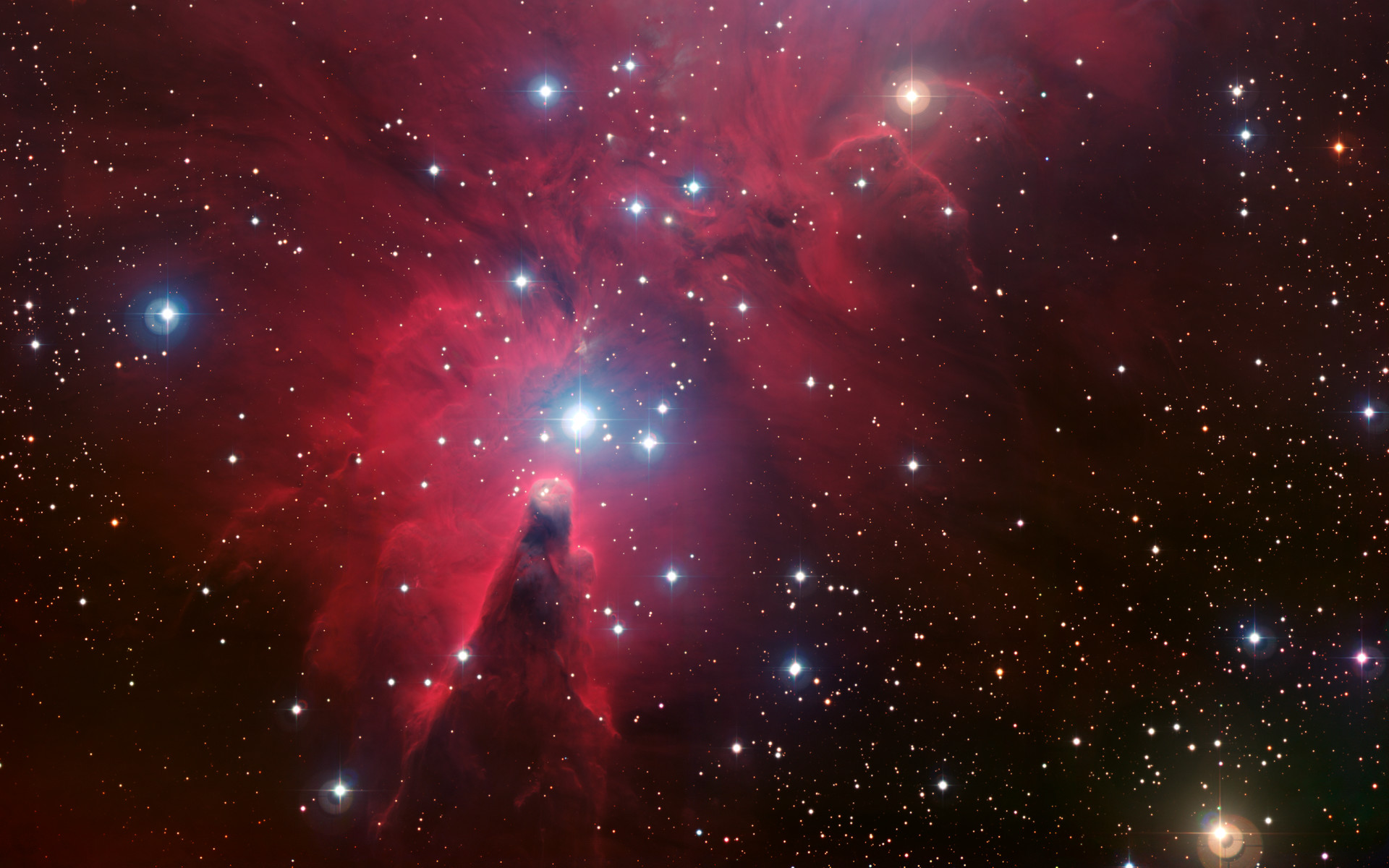 Cette image couleur de la région connue sous le nom de NGC 2264, une partie du ciel qui inclut les étoiles scintillantes bleues de l'amas de l'Arbre de Noël et la nébuleuse du Cône, a été créée en prenant des informations à travers quatres différents filtres (B, V, R, H-Alpha) avec le Wide Field Imager à l'observatoire ESO de La Silla se trouvant à 2400m d'altitude dans le desert d'Atacama au Chili. Cette image montre une région de l'espace d'une largeur de 30 années lumière.