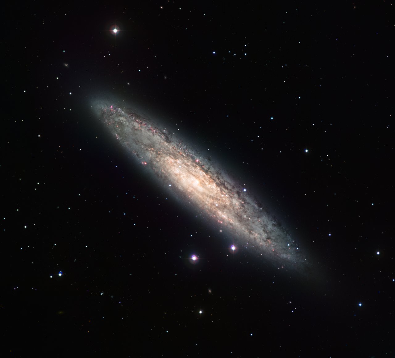 Mesurant 70 000 années-lumière de large et se trouvant à 13 millions d'années-lumière de nous, la galaxie spirale NGC 253 est révélée de côté dans une image du Wide Field Imager (WFI) du télescope MPG/ESO de 2.2 mètres de l'observatoire de la Silla. Cette image est basée sur des données obtenues à travers quatre différents filtres (R, V, H-Alpha et Olll). Le Nord est en haut et l'Est vers la gauche. Le champ de vue est de 30 arcminutes.