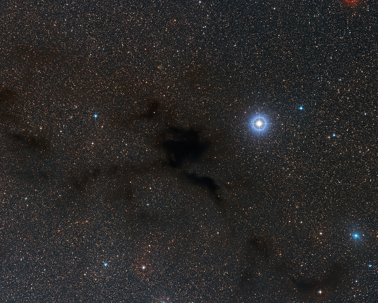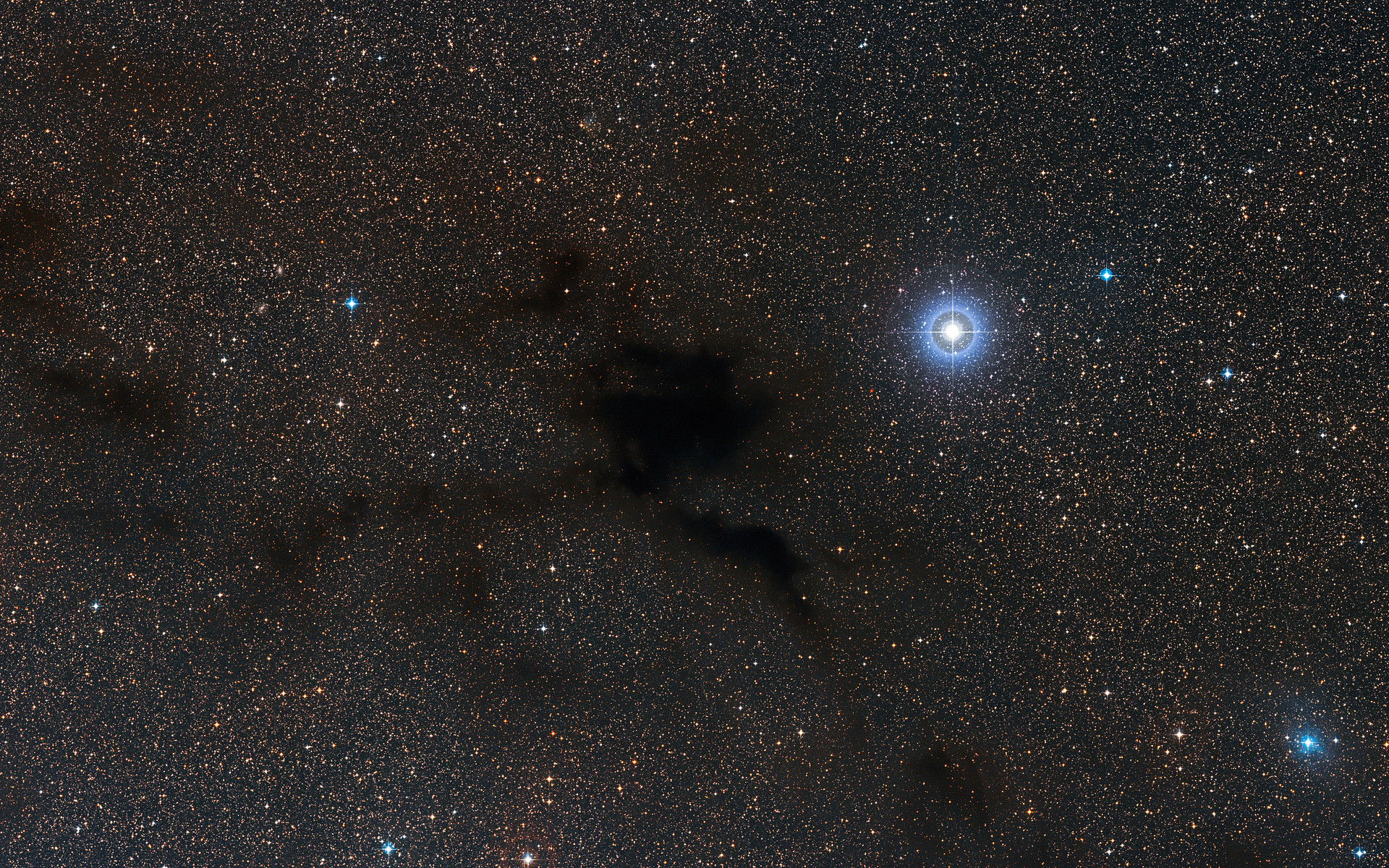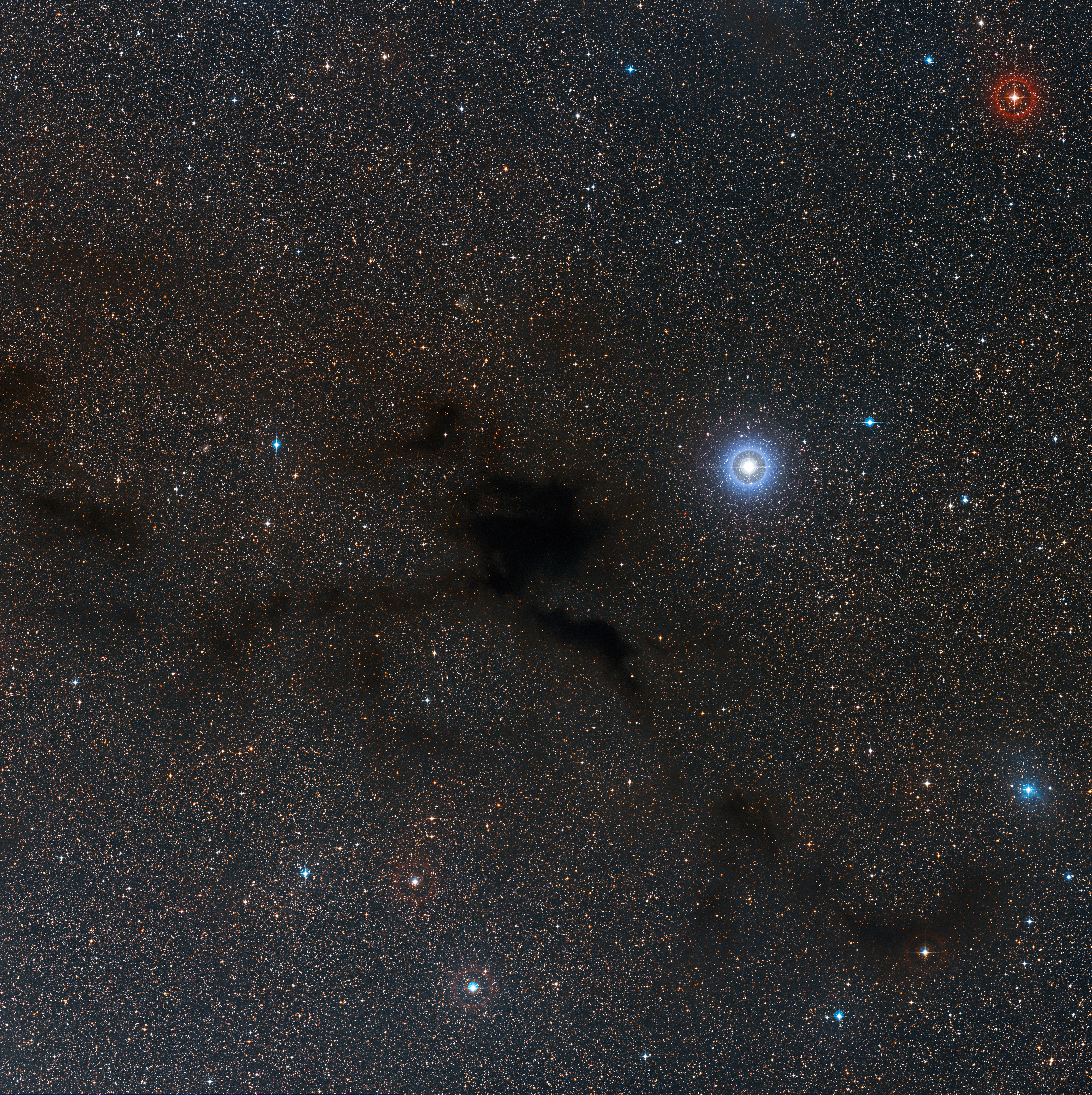 Cette image du ciel qui entoure le nuage sombre Lupus 4 a été constituée à partir des photographies issues du Digitized Sky Survey 2. Lupus 4 est un épais nuage de gaz et de poussière qui devrait prochainement donner naissance à de nouvelles étoiles. Le nuage se situe à quelque 400 années lumière de la Terre, à cheval sur les constellations du Loup (Lupus) et de La Règle (Norma).