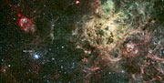 Les observateurs ne prêtent pas souvent attention à NGC 2100 car elle se trouve à proximité de l’impressionnante nébuleuse de la Tarentule (eso0650) et du super amas d’étoiles RMC 136 (eso1030). Le gaz brillant de la nébuleuse de la Tarentule tente encore de s’approprier la vedette sur cette image – ici, les couleurs claires correspondent à la périphérie de la nébuleuse. Cette nouvelle image a été réalisée à partir de clichés pris avec des filtres de différentes couleurs en utilisant l’instrument EMMI [1]sur le « New Technology Telescope » à l’Observatoire de La Silla de l’ESO au Chili. Les étoiles sont montrées dans leurs couleurs naturelles alors que la lumière provenant de l’hydrogène ionisé (montrée ici en rouge) et de l’oxygène (montrée en bleu) est accentuée.