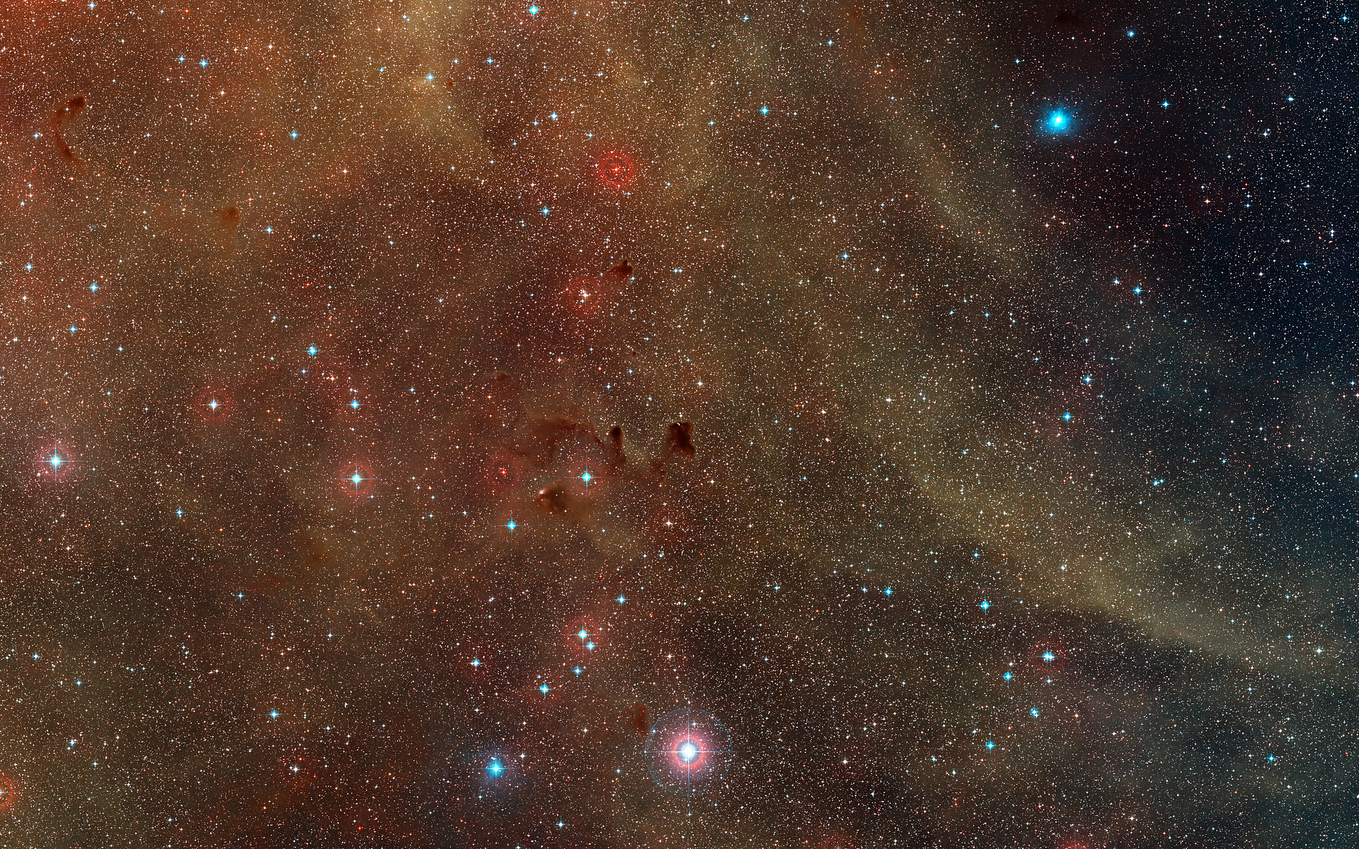 Deze overzichtsfoto toont een rijk gebied van stofwolken en stervorming in het zuidelijke sterrenbeeld Zeilen. Ongeveer in het midden is te zien hoe de jets van het Herbig-Haro-object HH46/47 tevoorschijn komen uit een donkere wolk waarbinnen sterren worden geboren.