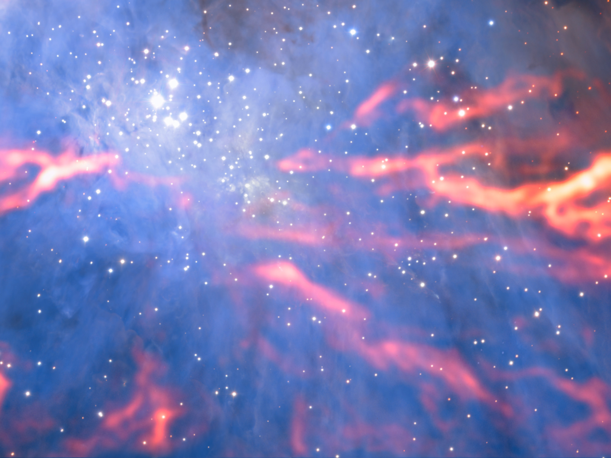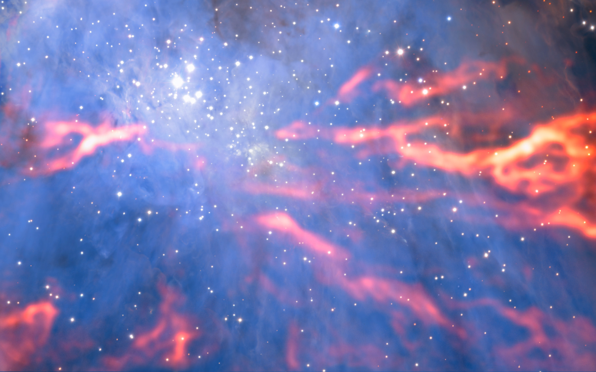 Deze spectaculaire en ongewone afbeelding toont een deel van de beroemde Orionnevel, een stervormingsgebied op ongeveer 1350 lichtjaar van de aarde. Ze is een combinatie van een mozaïek van millimetergolflengte-opnamen van de Atacama Large Millimeter/submillimeter Array (ALMA) en de IRAM 30-meter telescoop, weergegeven in rood, en een vertrouwder ogende infraroodopname van het HAWK-I-instrument van ESO’s Very Large Telescope (blauw gekleurd). De groep heldere blauwwitte sterren linksboven is de Trapezium-sterrenhoop, die uit jonge, hete sterren van slechts een paar miljoen jaar oud bestaat.