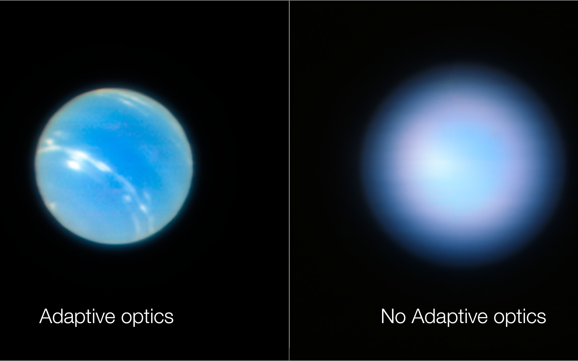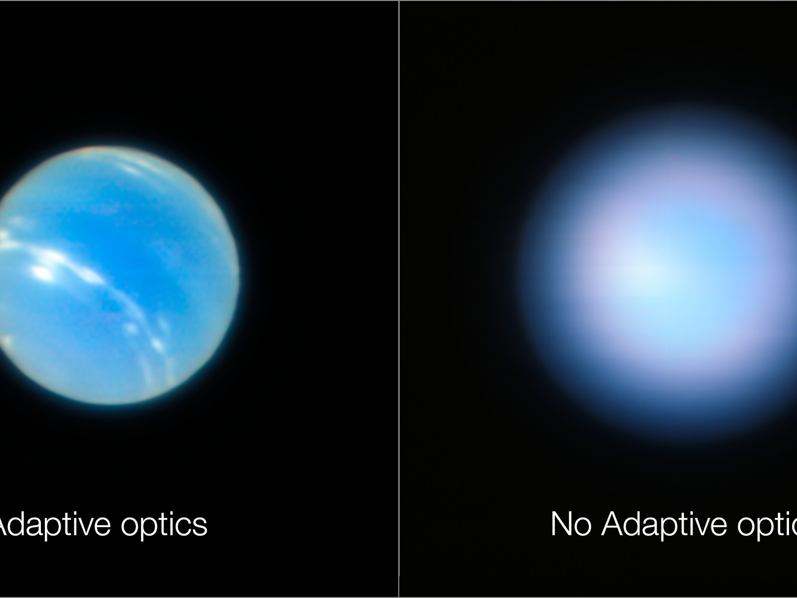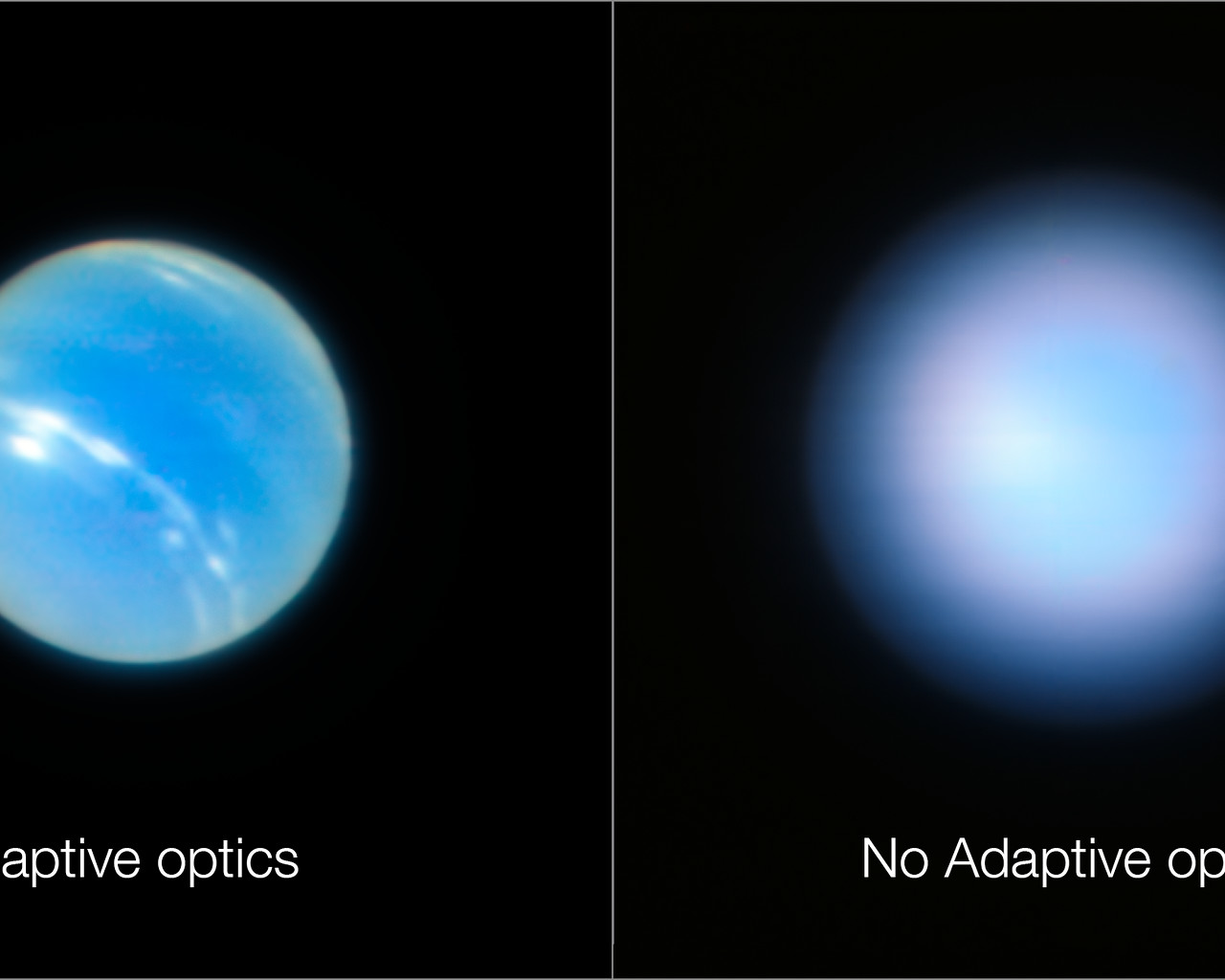 Deze foto’s van de planeet Neptunus zijn gemaakt tijdens het testen van de Narrow Field adaptieve optische modus van het MUSE/GALACSI-instrument van ESO’s Extremely Large Telescope. De foto rechts is gemaakt terwijl de adaptieve optiek uit stond, de foto links na het inschakelen ervan.