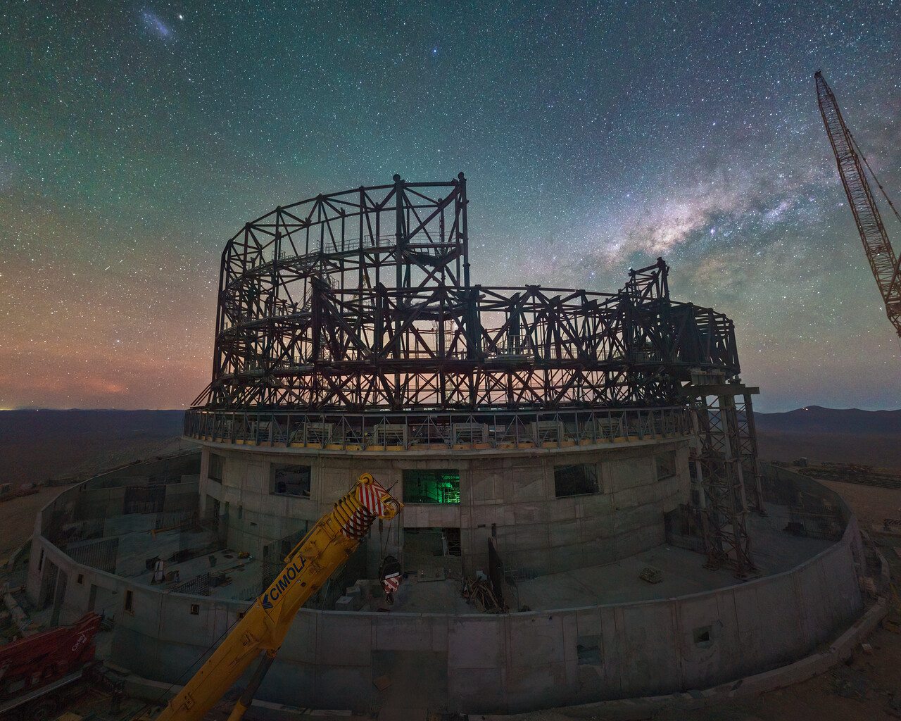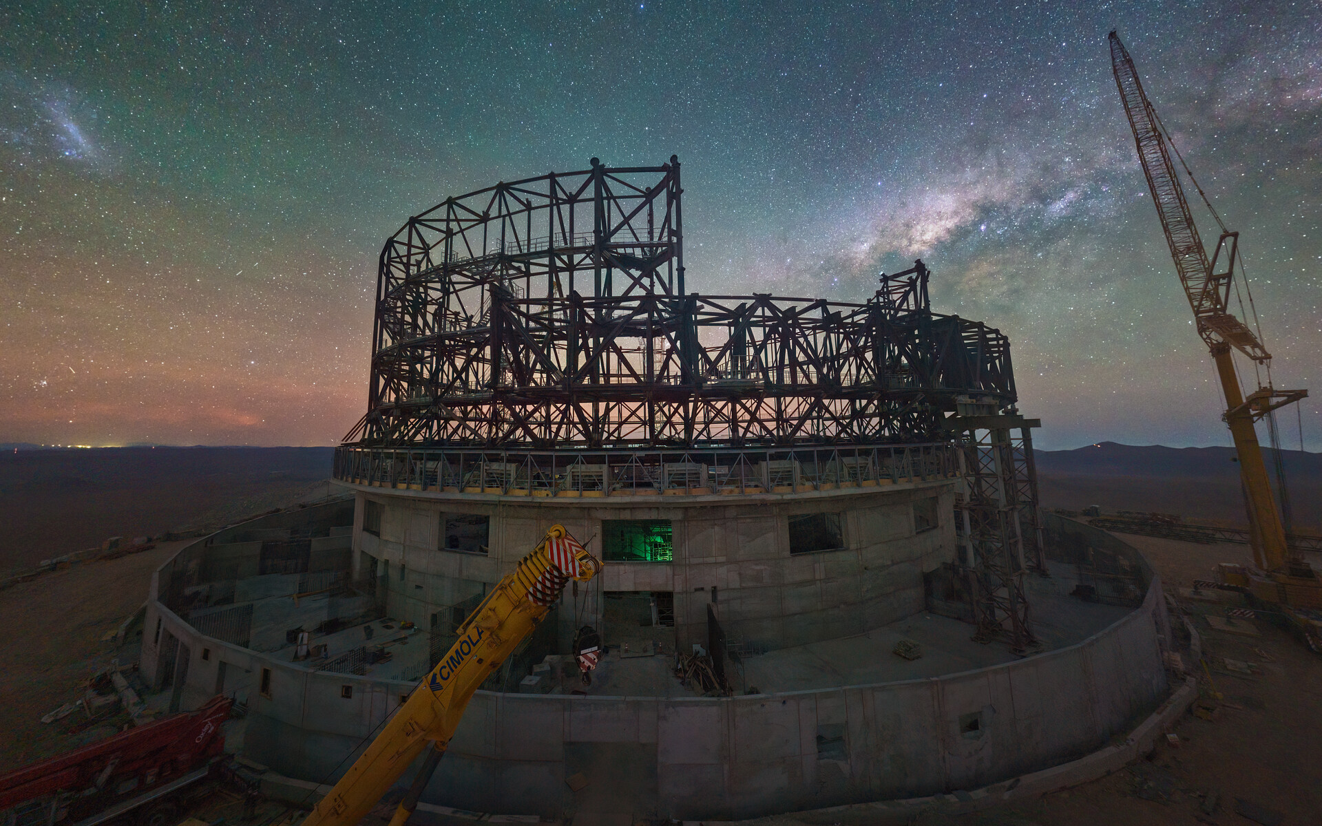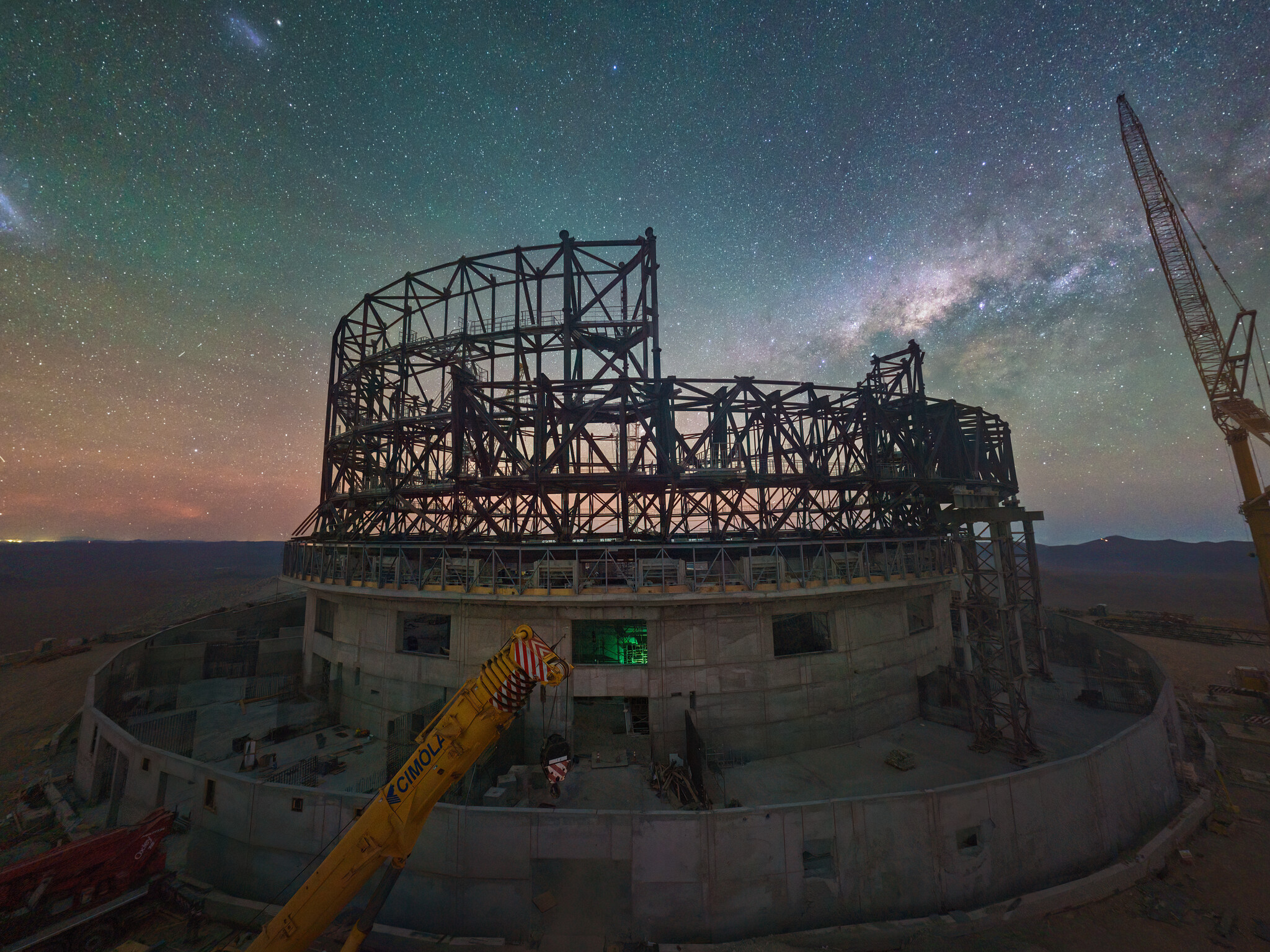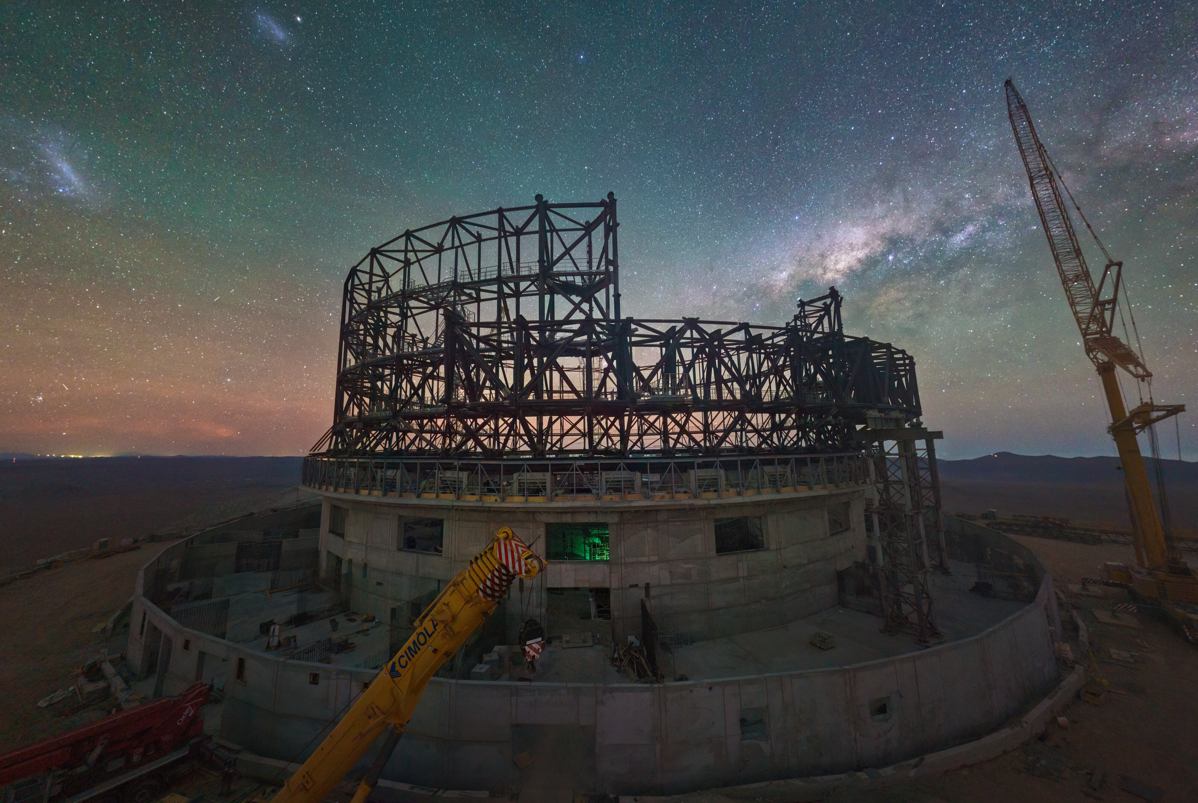 Nachtopname van de ELT in aanbouw bovenop Cerro Armazones
