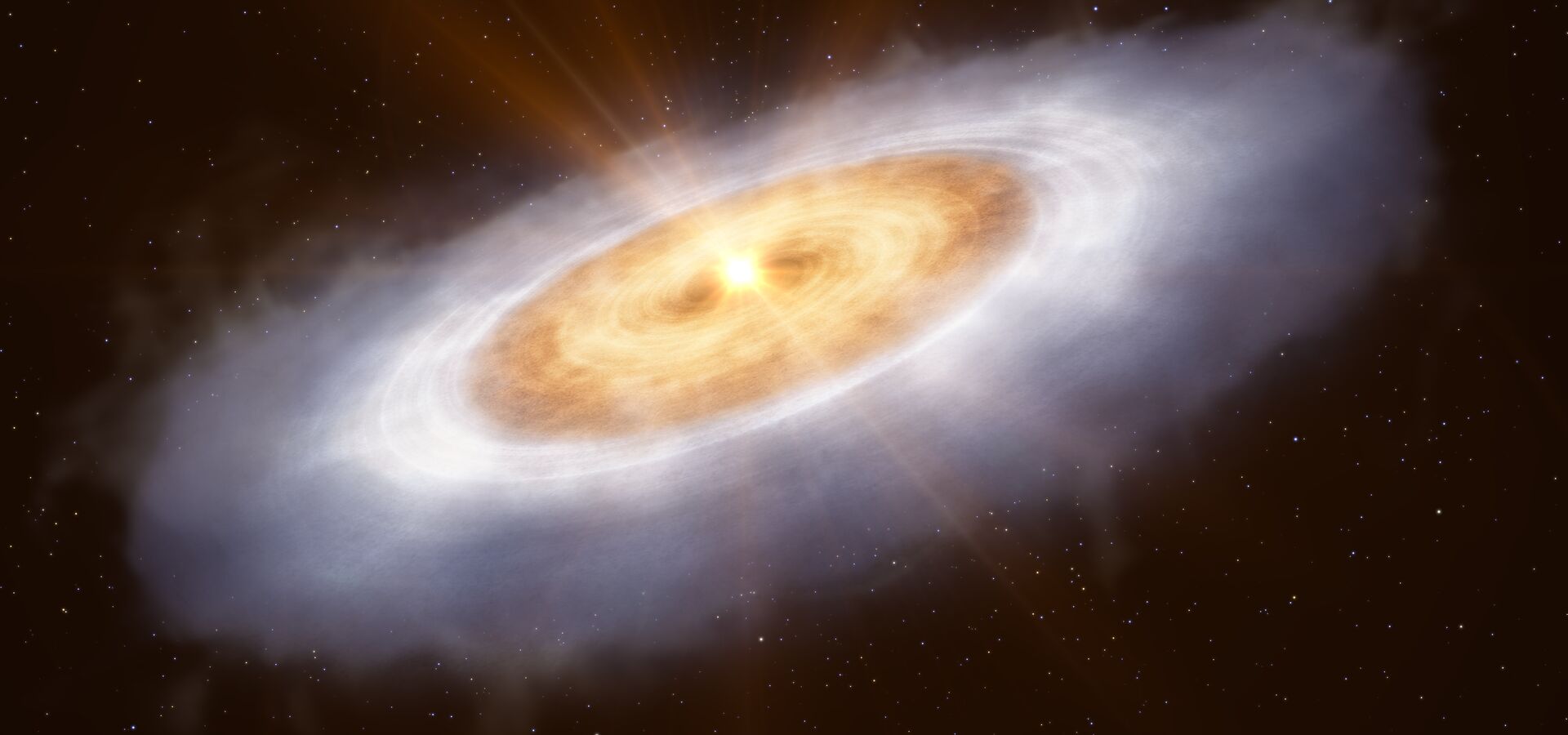 In the next phase gravity slowly takes over and the clump of molecular gas gets denser and denser until it collapses, forming a ‘proto-star’. A lot of heat is generated from this collapse and further transferred to the surrounding material. As the dust grains heat up in the central parts of the cloud, the frozen water that coats them sublimates, instantly turning to gas without first becoming liquid. But further out, the bulk of the water reservoir remains frozen. This water ice is harder to detect than gaseous water, but it’s also less prone to being altered by chemical processes. Water thus becomes the second most abundant molecule (after molecular hydrogen) in this warm cloud around the baby star, which contains 10 000 times more water than the oceans on Earth combined.