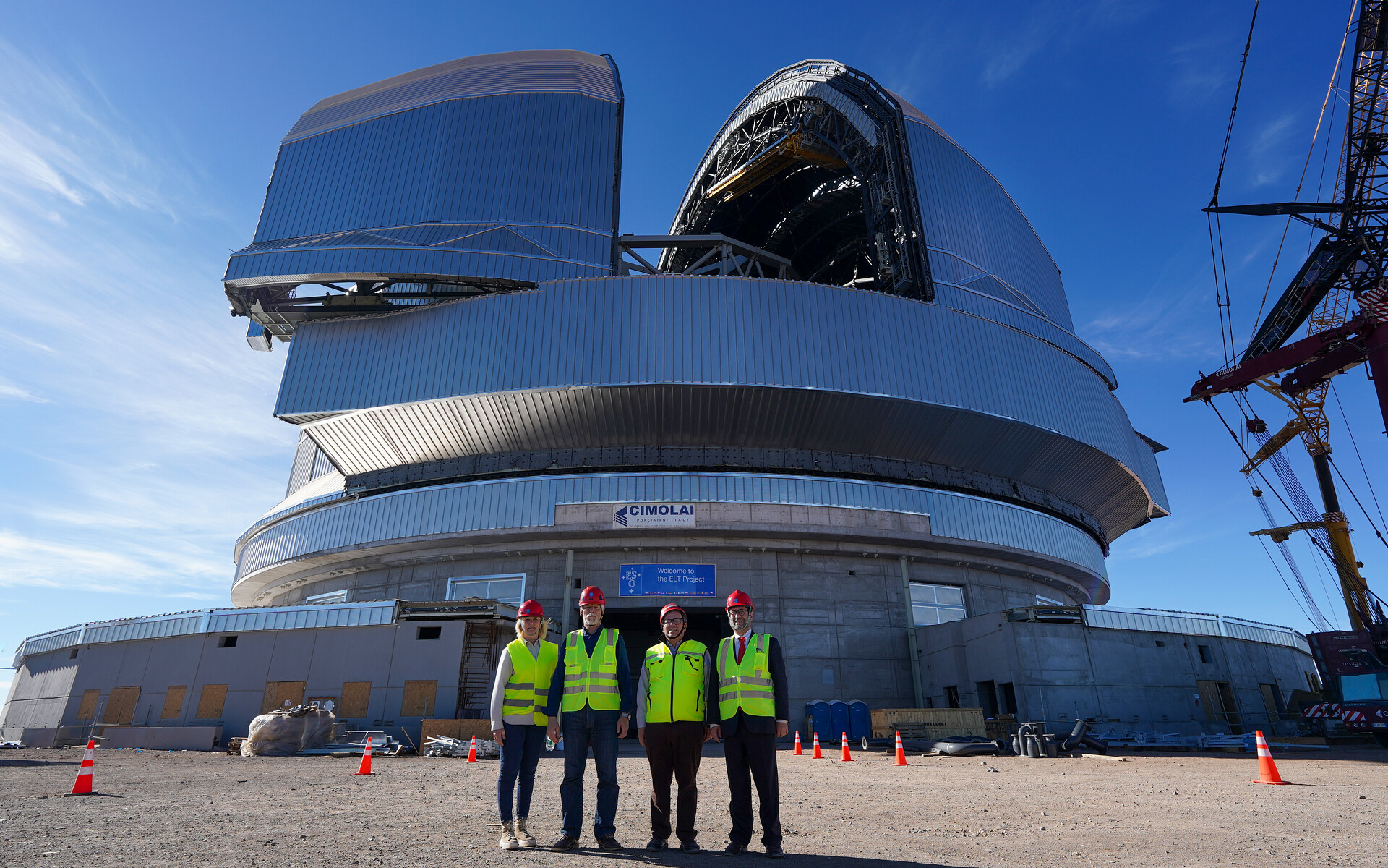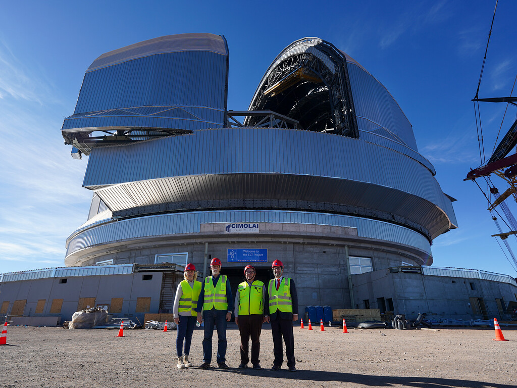Petr Pavel, Presidente de la República Checa (centro izquierda), su esposa Eva Pavlová (izquierda), Francisco Pérez Mackenna, Ministro de Relaciones Exteriores de Chile (derecha), y Xavier Barcons, Director General de ESO (centro derecha), posan frente al Telescopio Extremadamente Grande de ESO en Chile.