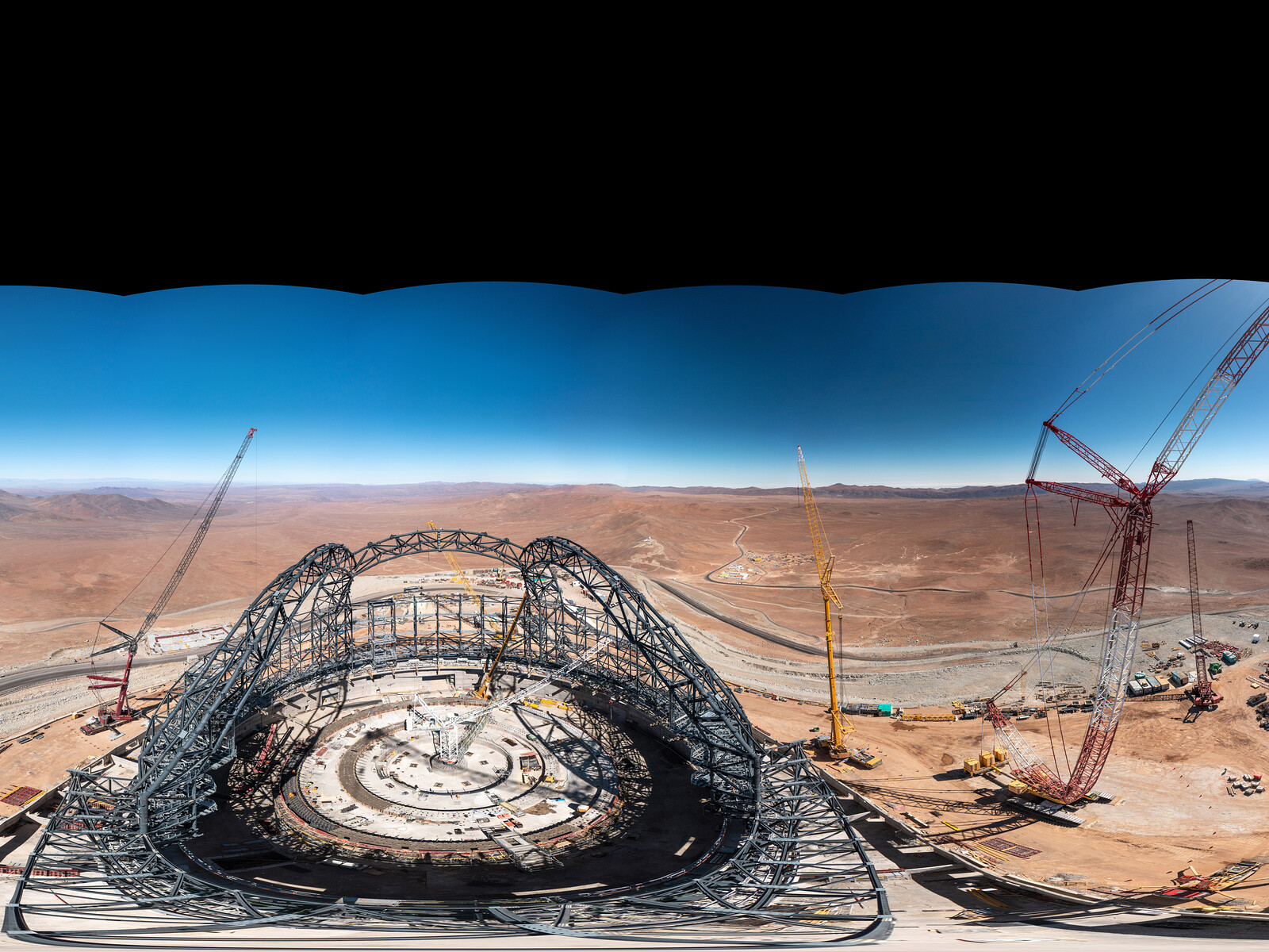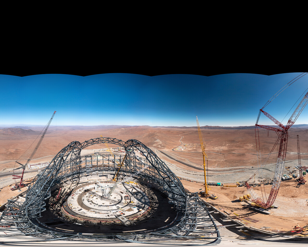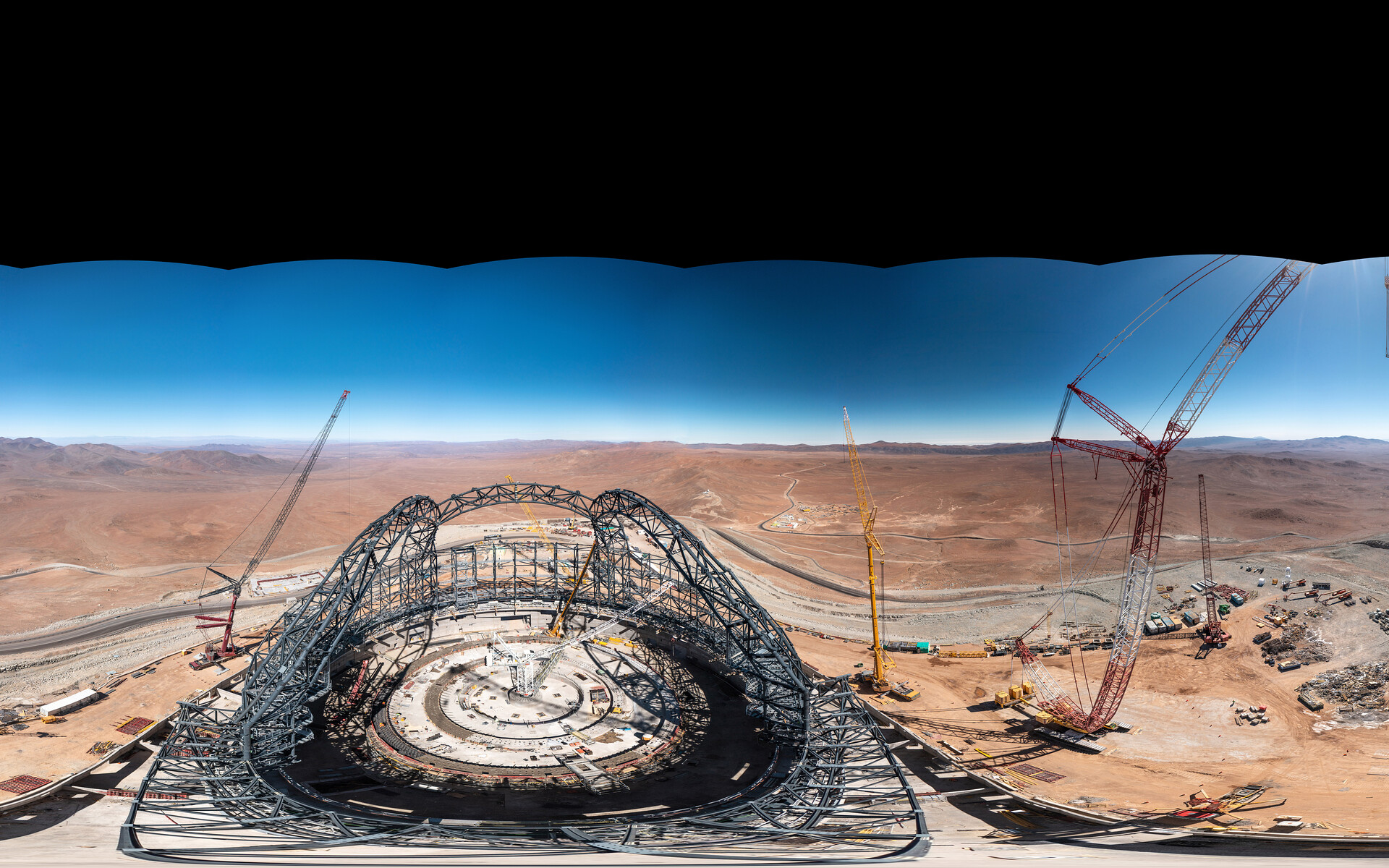 Panorámica de 360 grados captada a principios de agosto de 2023, que muestra al Extremely Large Telescope (ELT) de ESO, en construcción en Cerro Armazones, Chile. Cuando se tomó esta fotografía, la estructura de acero de la cúpula del telescopio estaba adquiriendo su forma. Una vez completada, la cúpula pesará 6100 toneladas y se necesitarán 30 millones de pernos para mantener unida la estructura. El ELT de ESO será un telescopio terrestre revolucionario con un espejo principal de 39 metros.