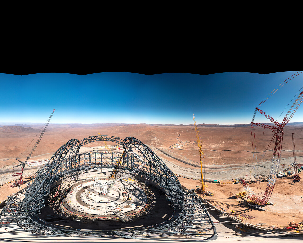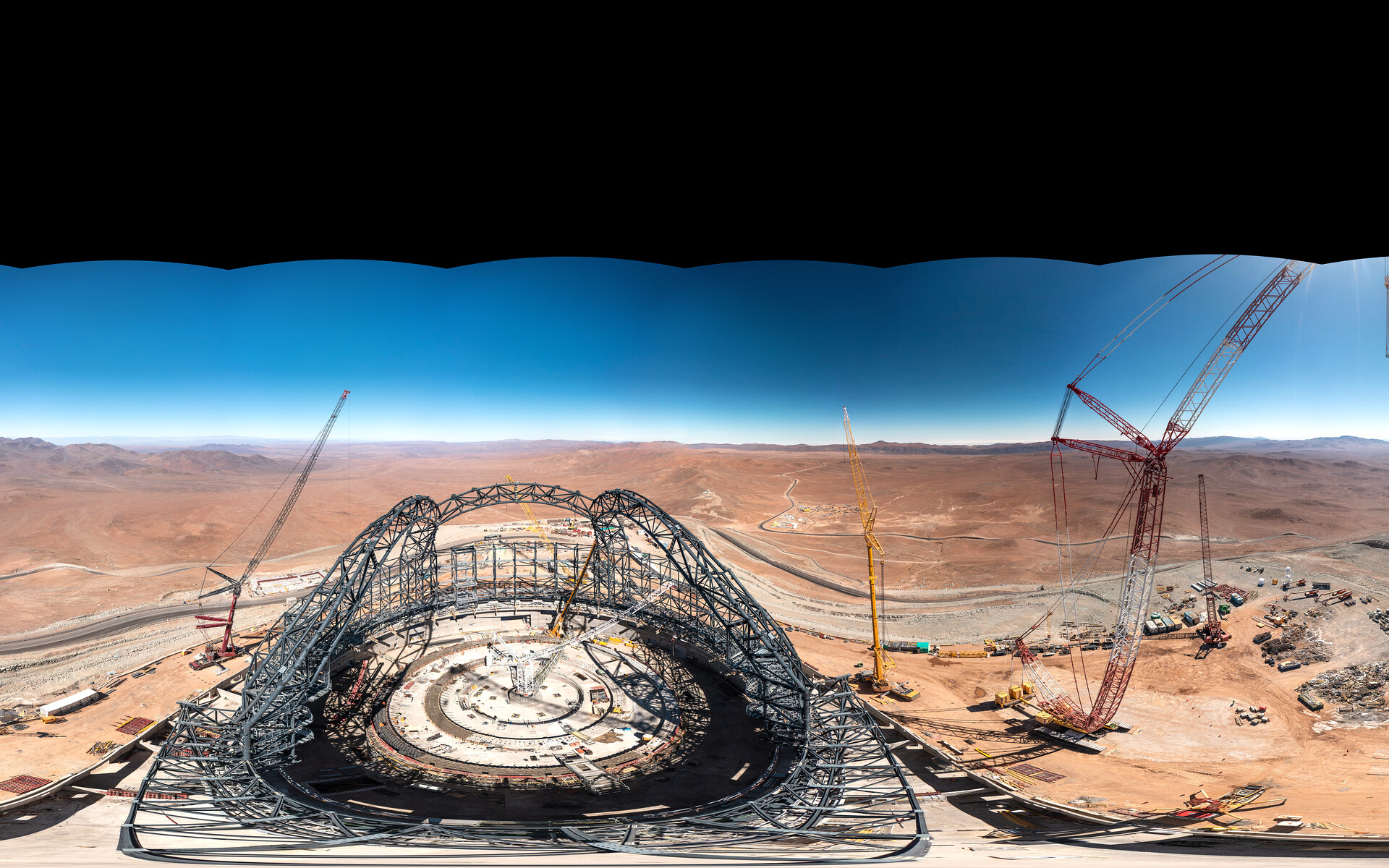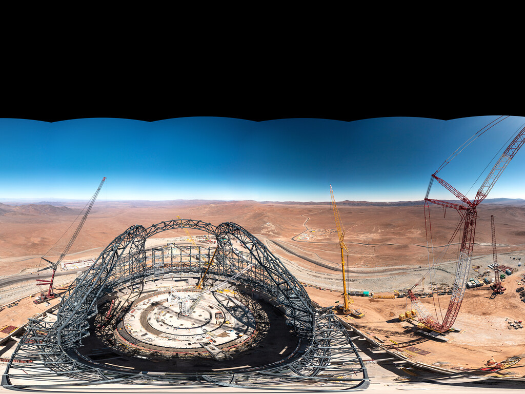 Panorámica de 360 grados captada a principios de agosto de 2023, que muestra al Extremely Large Telescope de ESO (ELT), en construcción en Cerro Armazones, Chile. Cuando se tomó la fotografía, la estructura de acero de la cúpula del telescopio estaba adquiriendo su forma. Una vez completada, la cúpula pesará 6100 toneladas y se necesitarán 30 millones de pernos para mantener unida la estructura. El ELT de ESO será un telescopio terrestre revolucionario con un espejo principal de 39 metros.