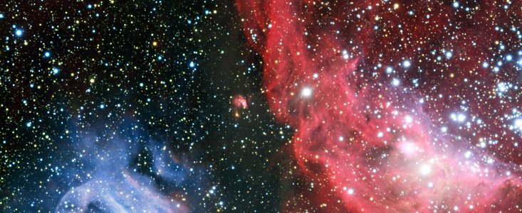 El telescopio VLT (Very Large Telescope) de ESO ha obtenido imágenes de una fascinante región de formación de estrellas en la Gran Nube de Magallanes — una de las galaxias satélite de la Vía Láctea. Esta precisa imagen revela dos peculiares y brillantes nubes de gas: la rojiza NGC 2014 y su vecina azulada NGC 2020. Pese a que son muy diferentes, ambas fueron esculpidas por potentes vientos estelares procedentes de estrellas recién nacidas extremadamente calientes que también irradian el gas, provocando que brille de forma intensa.
