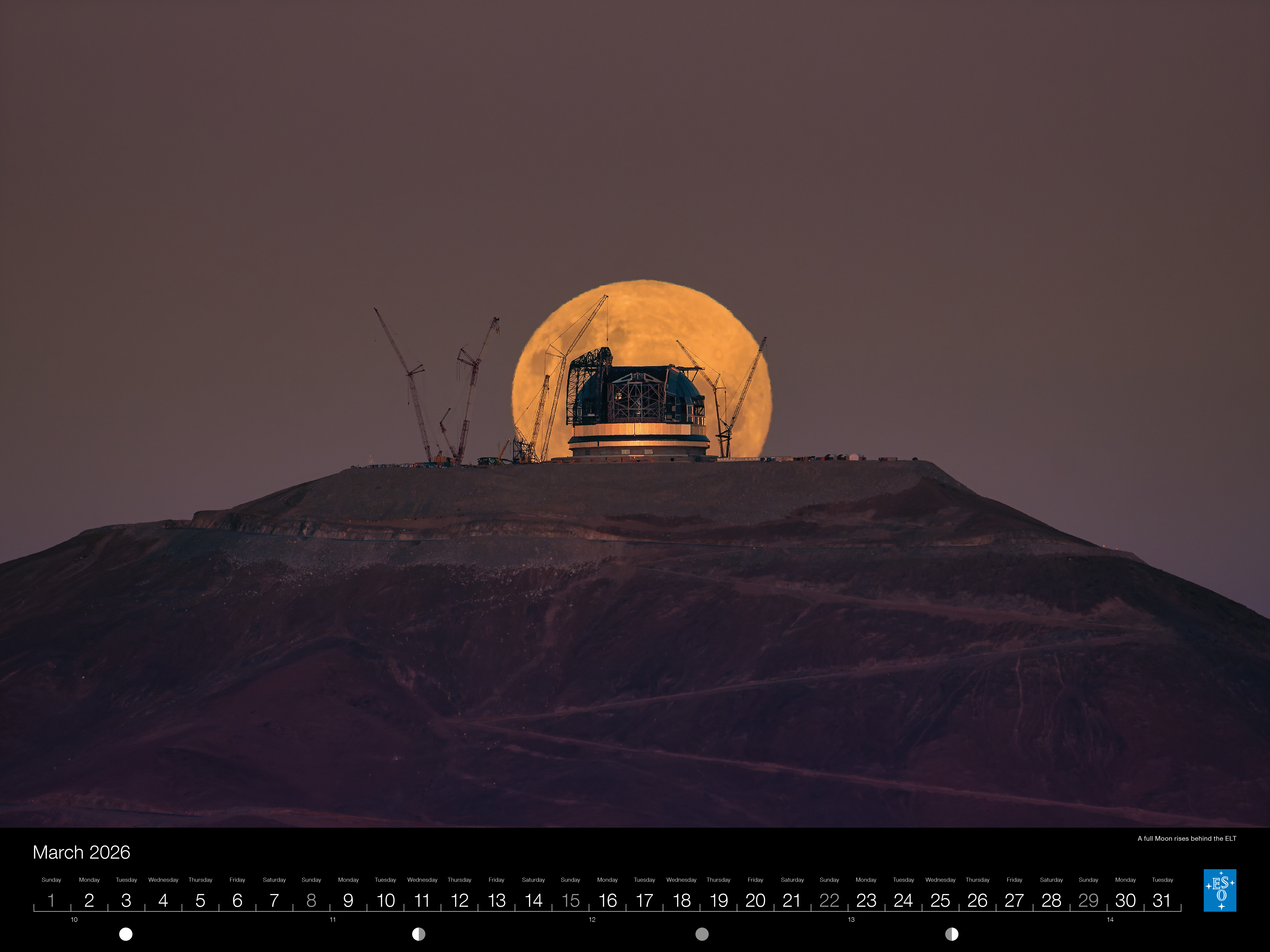 The full Moon looms large in this picture, framing ESO’s Extremely Large Telescope (ELT). Taken at precisely the moment that the rising Moon appears to perch atop Cerro Armazones, this perfectly timed photo captures the striking halo created around the ELT’s ongoing construction.