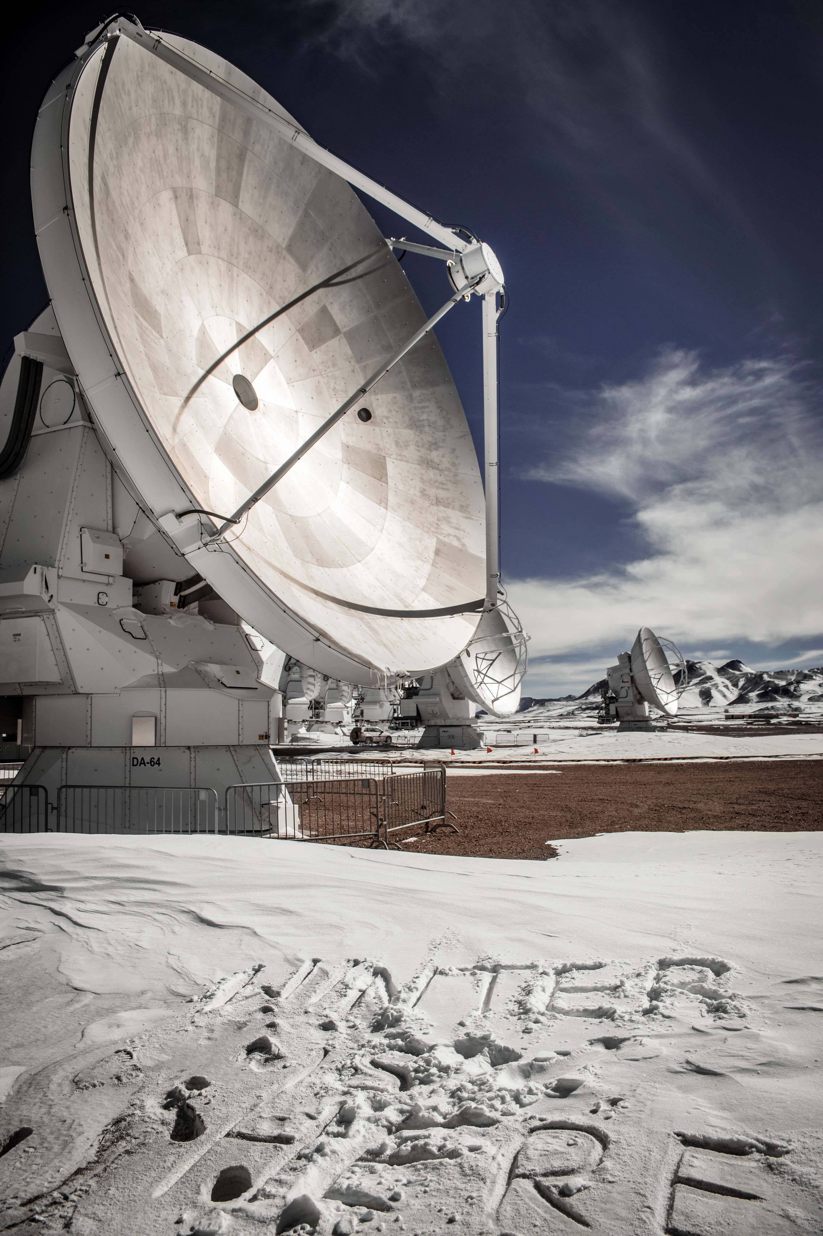 ALMAAntennas in the snow on a cold day in the Chilean winter. In front of the closest one someone has written a portentous phrase in the snow: "Winter is here."