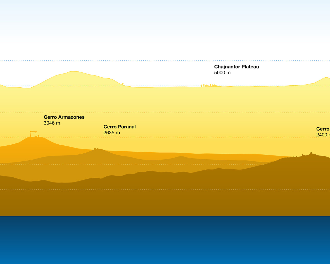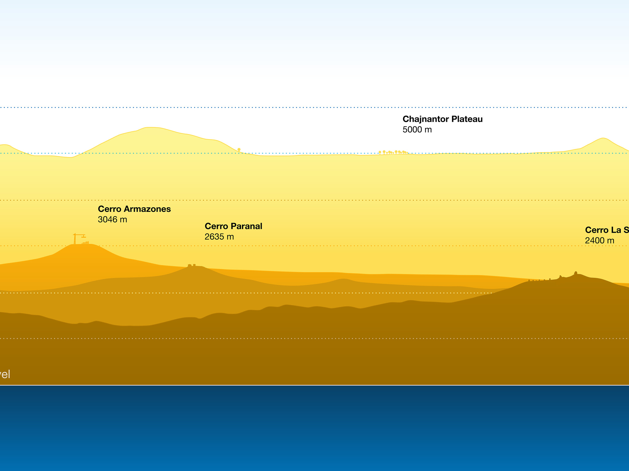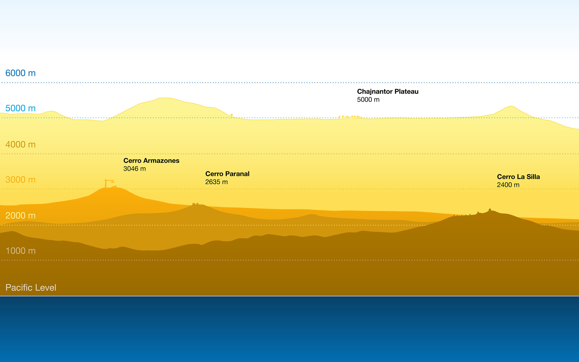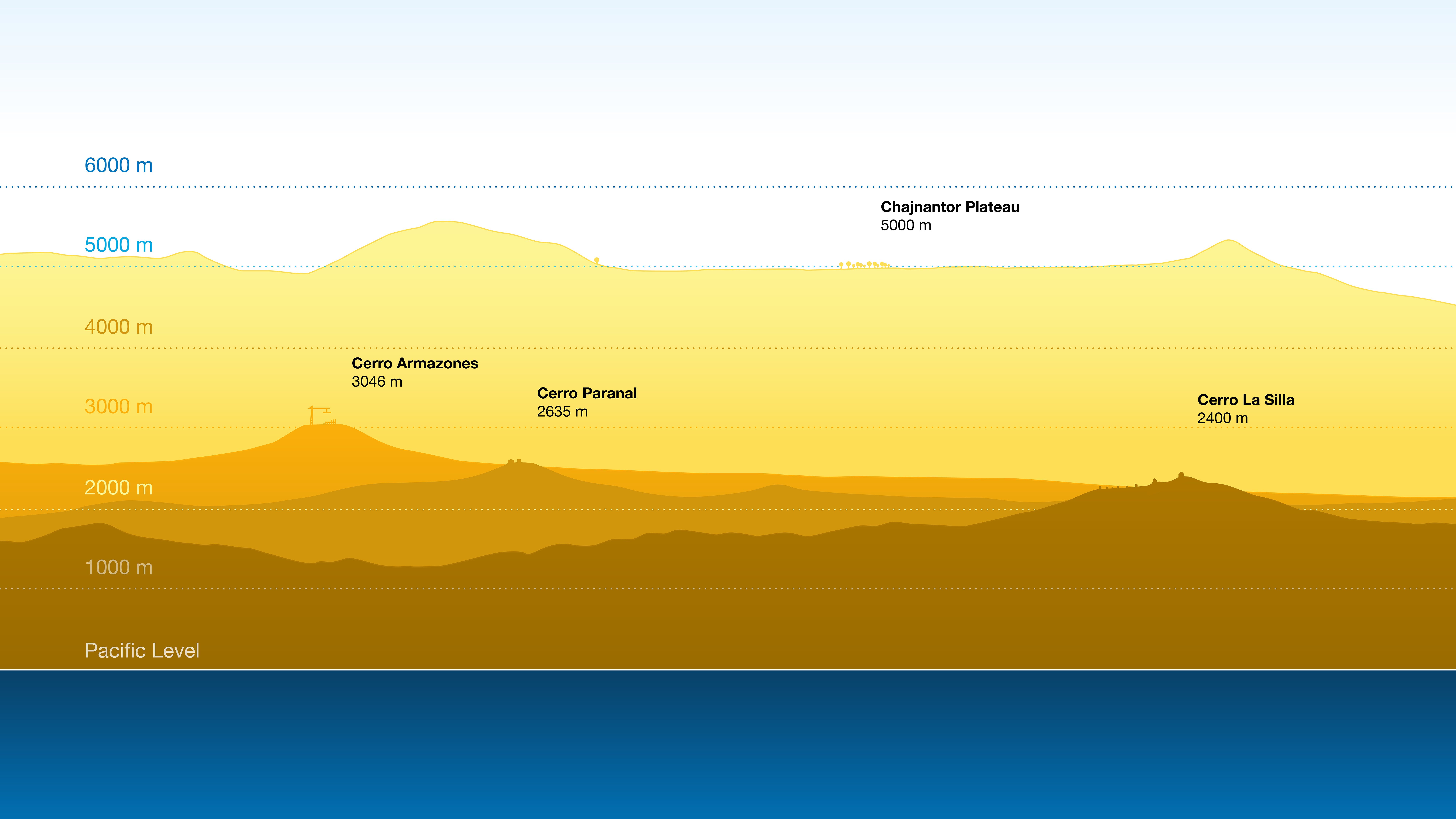 The pristine skies above ESO’s observing sites are perfectly suited to astronomical observations thanks, in part, to the high and dry environments in and near the Chilean Atacama Desert. The Atacama Large Millimeter/submillimeter Array (ALMA), whose observations can be heavily affected by water vapour in the atmosphere, requires the highest elevation site at 5000 metres near the Chilean Andes. ESO’s optical and infrared observatories — at Cerro Paranal, home of the Very Large Telescope (VLT), Cerro Armazones, where the Extremely Large Telescope (ELT) is under construction, and Cerro La Silla — lie at around 3000 metres. These remote sites are far away from the nearest cities, away from sources of light pollution.