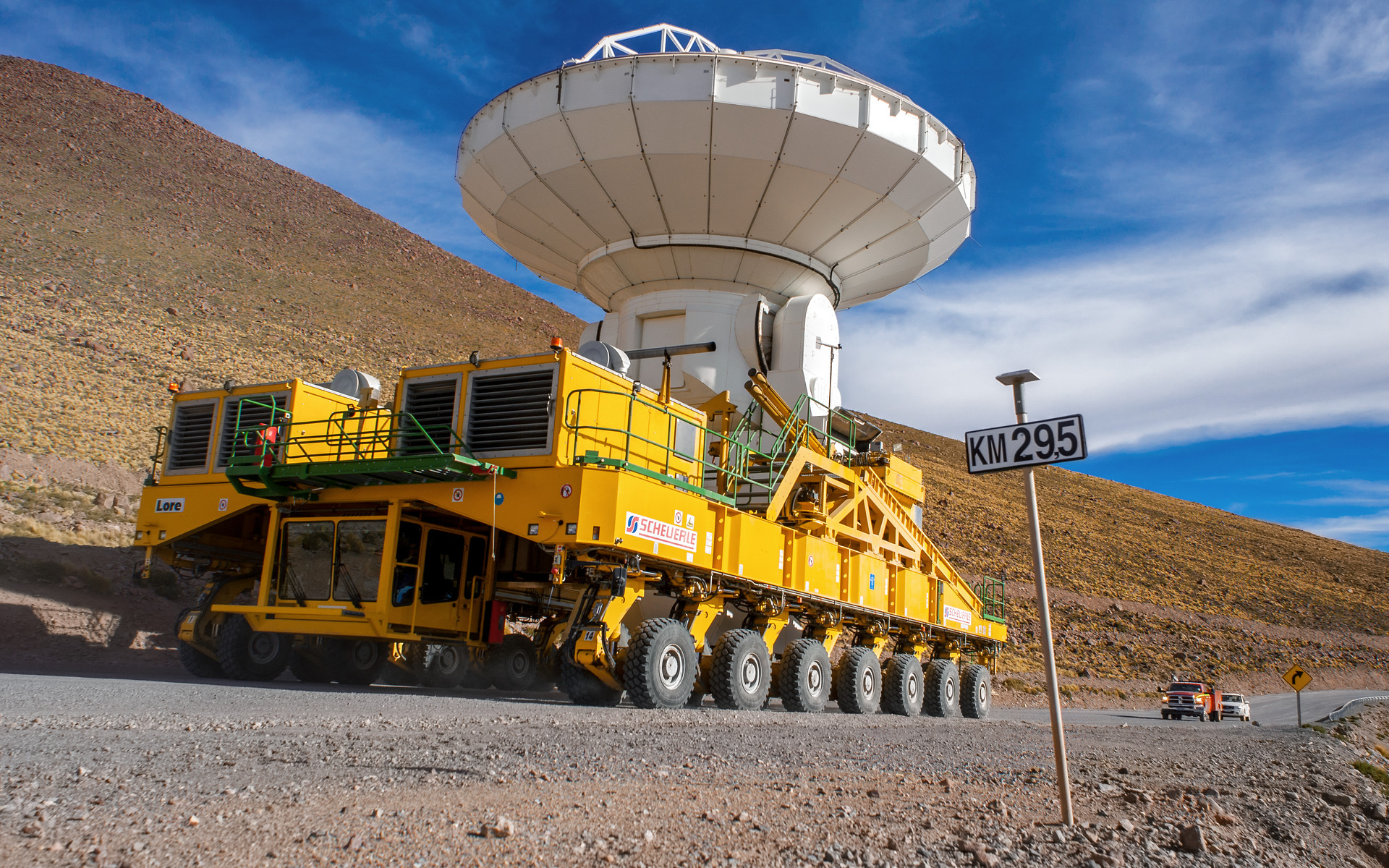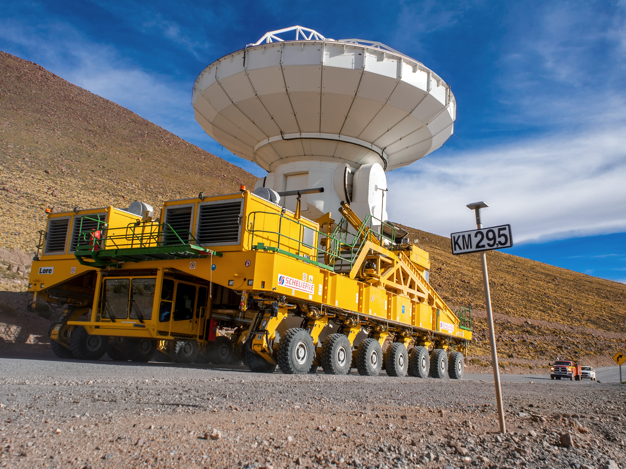 The Atacama Large Millimeter/submillimeter Array (ALMA) — comprises 66 high-precision antennae, spread over distances of up to 16 kilometres. The ability to reposition the antennae is part of what makes ALMA such a powerful telescope. Each state-of-the-art component weighs in at over 100 tons, yet despite their bulk they require incredibly precise positioning. That is where the ALMA transporters, fondly named Otto and Lore, come in. These bright yellow behemoths are able to position the antennas to within a few millimetres, ensuring accurate placement on the antenna foundation pads.
