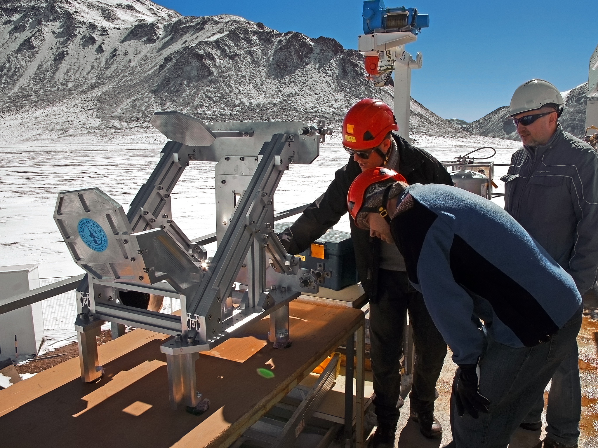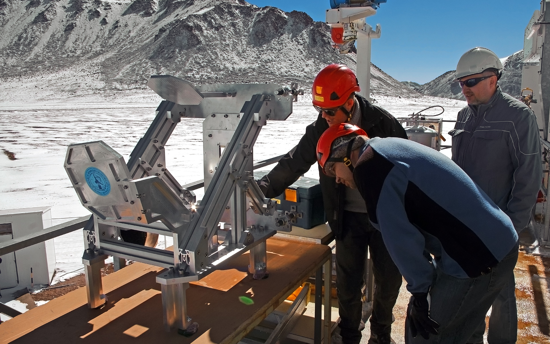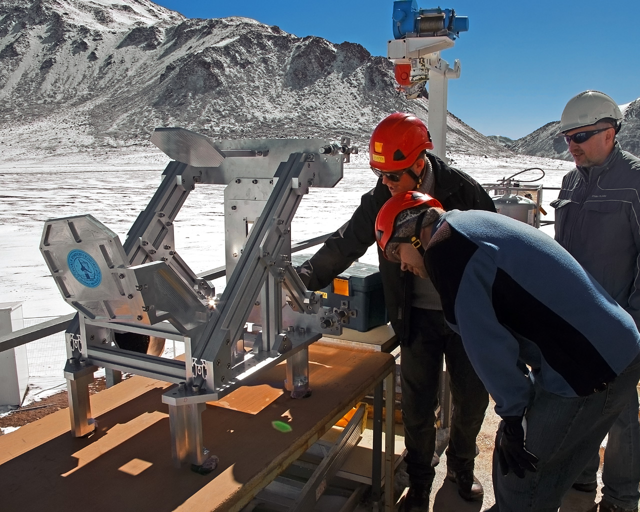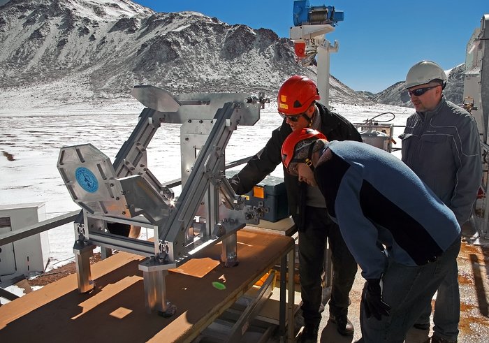 Na snímku inženýři OSO-GARD (Onsala Space Observatory's Group for Advanced Receiver Development) prohlížejí horní část přístroje SEPIA před instalací na anténu APEX. Vlevo Mathias Fredrixon a Denis Meledin (skloněný), vzadu Igor Lapkin.