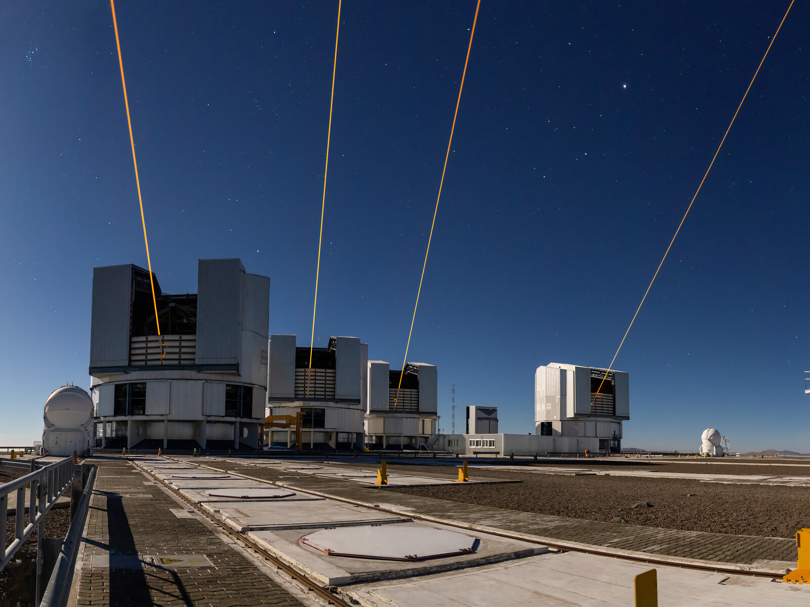 Tato fotografie zachycuje čtyři lasery v observatoři ESO v Paranalu, z nichž každý je spuštěn z jednoho ze čtyř osmimetrových dalekohledů v areálu. Spuštění těchto laserů představuje významný milník pro interferometr VLTI (Very Large Telescope Interferometer) ESO, který kombinuje světlo z těchto osmimetrových dalekohledů, a pro projekt GRAVITY+ – rozsáhlou a komplexní modernizaci VLTI. Díky instalaci laseru na každém z osmimetrových dalekohledů vytváří každý laser 90 km nad povrchem Země jasnou „falešnou“ hvězdu, což umožňuje korekci atmosférického rozostření kdekoli na obloze. To otevírá VLTI celou jižní oblohu a dramaticky zvyšuje pozorovací výkon.