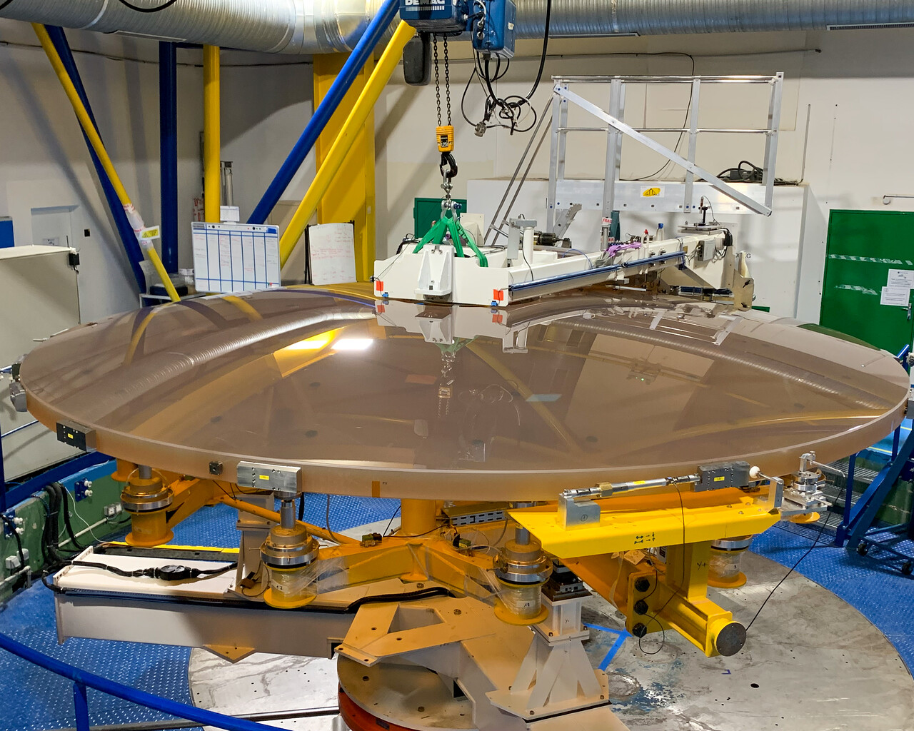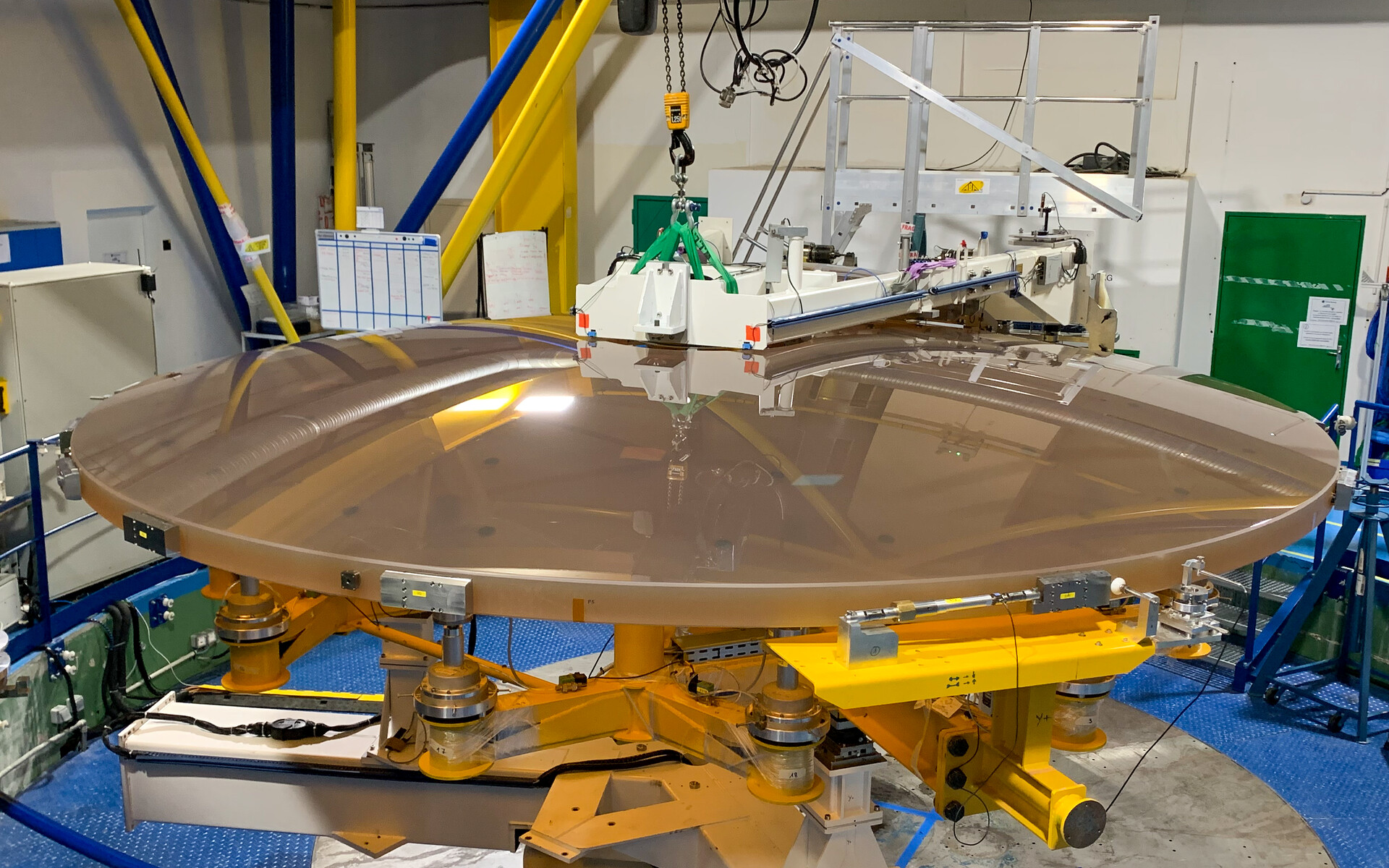 At 4.25 metres across, the Extremely Large Telescope’s (ELT's) secondary mirror, M2, will be the largest optical secondary mirror ever used on a telescope. Here, the Safran Reosc team in France is measuring the accuracy of the M2’s surface; it needs to be accurate to a few nanometres, about 20 000 times thinner than a human hair.