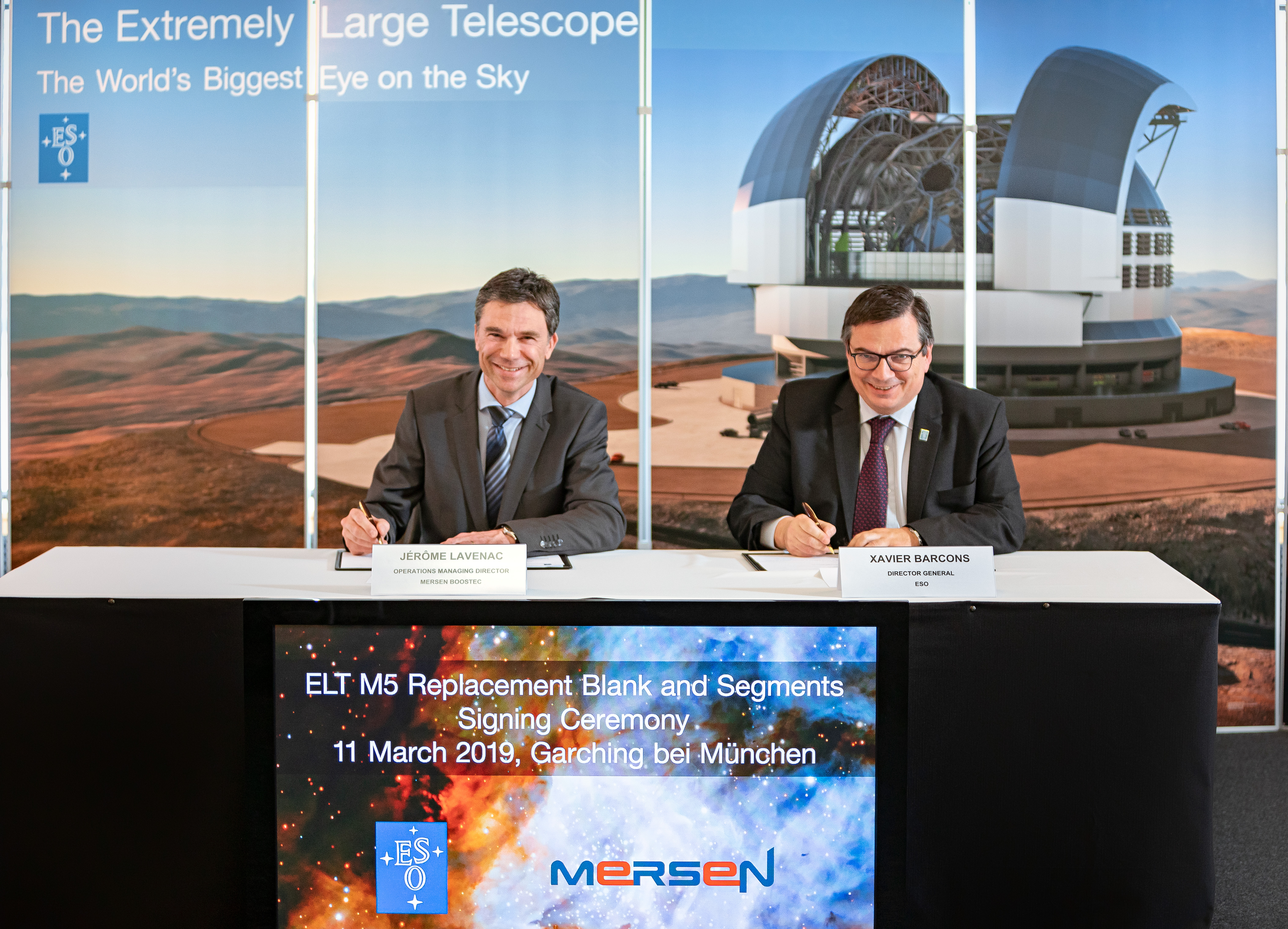 ESO's Director General Xavier Barcons and Jérôme Lavenac, Operations Managing Director of Mersen Boostec, sign a contract for the provision of components of ESO's Extremely Large Telescope (ELT). The signing took place during a ceremony on 11 March 2019 at ESO Headquarters in Garching, Germany. Mersen Boostec will provide the lightweight substrate for Mirror 5 (M5) to the specifications of Safran Reosc, the French optics company who also signed a contract during this ceremony, to provide M5 and its auxiliary equipment. Mersen Boostec will also supply the M5 replacement blanks if necessary.