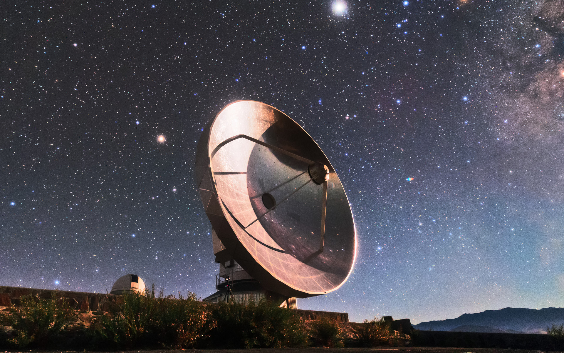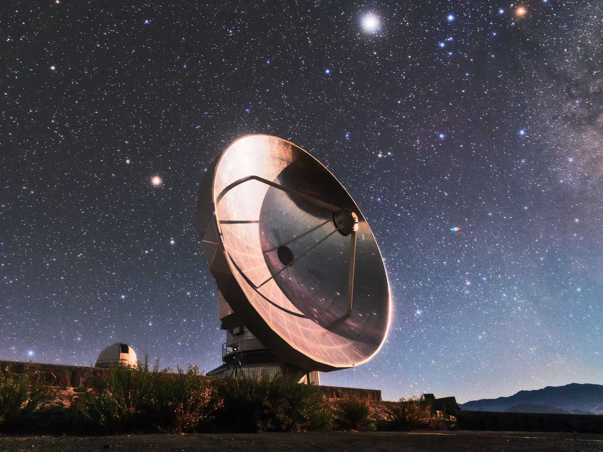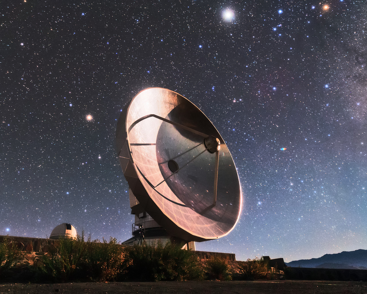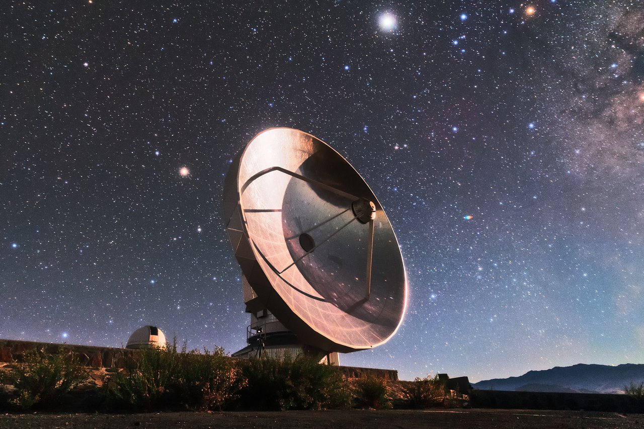 The Swedish-ESO Submillimetre Telescope (SEST) reflects starlight from the sky above La Silla, ESO’s original observatory. Though now decommissioned, SEST was the only large sub-millimetre telescope in the southern hemisphere at the time of its first light, and helped pave the way for APEX and ALMA. During its operations, the instrument SIMBA was installed on it, measuring radio waves and allowing astronomers to study celestial objects including planet-forming discs around nearby stars, and distant galaxies of the early Universe. La Silla, which hosts several national telescopes, was inaugurated in 1969, and celebrates its 50th anniversary this year. It is situated at an altitude of 2400 metres in the outskirts of the Chilean Atacama Desert, where it enjoys more than 300 clear nights per year. It remains scientifically relevant among newer observatories; over 300 refereed publications per year are attributable to La Silla’s work, making it one of the most productive observatories in the world.