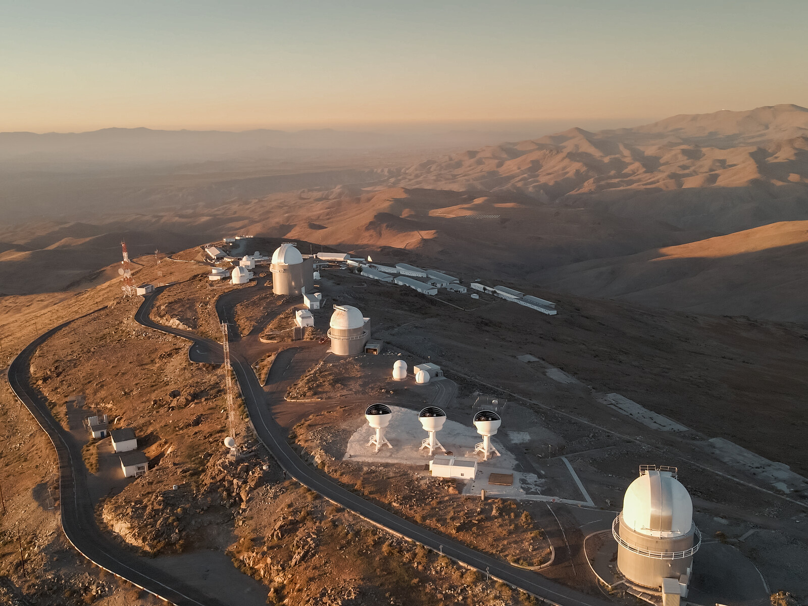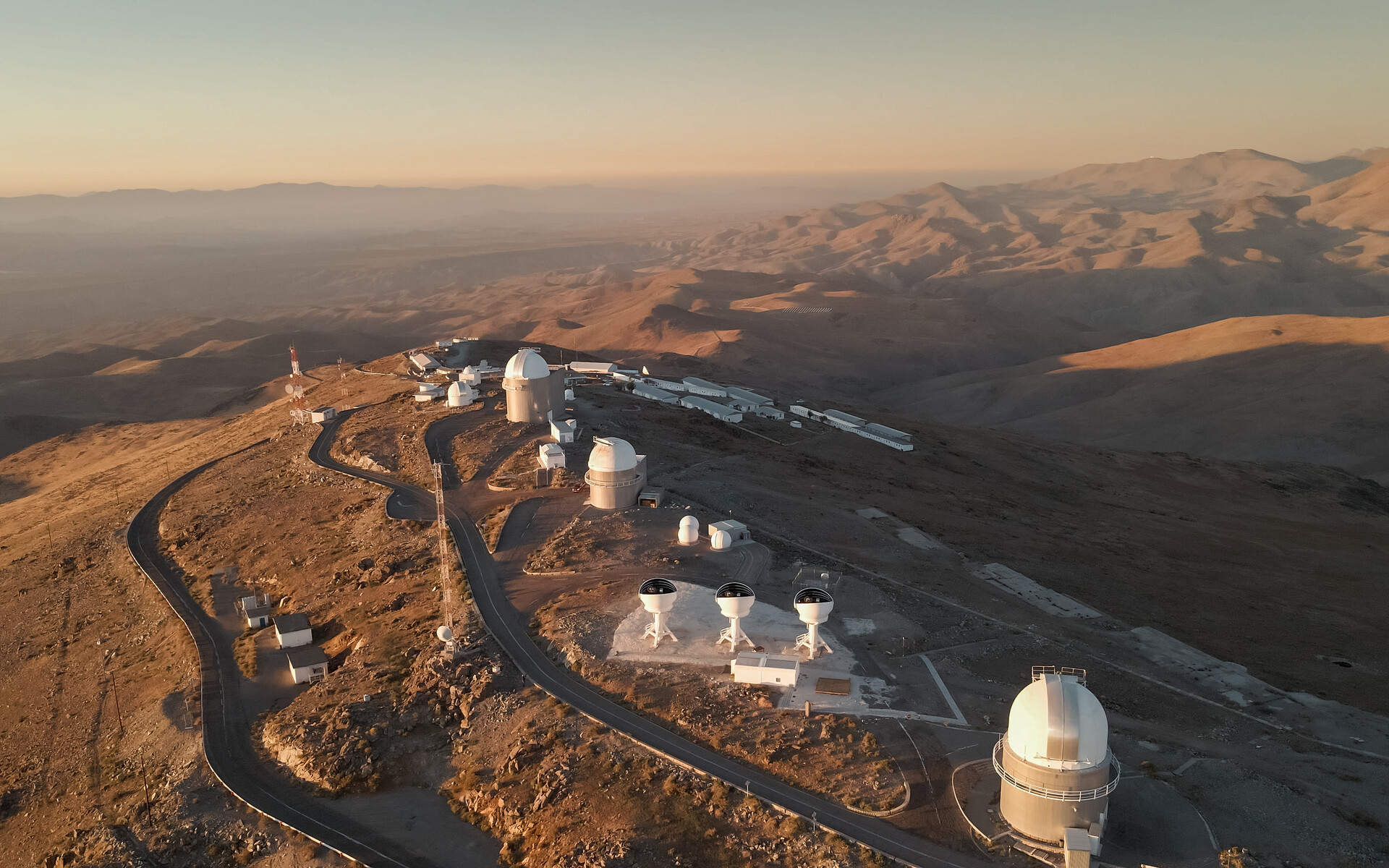 This drone shot shows some of the telescopes at ESO's La Silla Observatory in the foreground and the vast desert terrain around the Chilean mountain in the background. The three open domes at the centre of the image host the telescopes of the BlackGEM array.