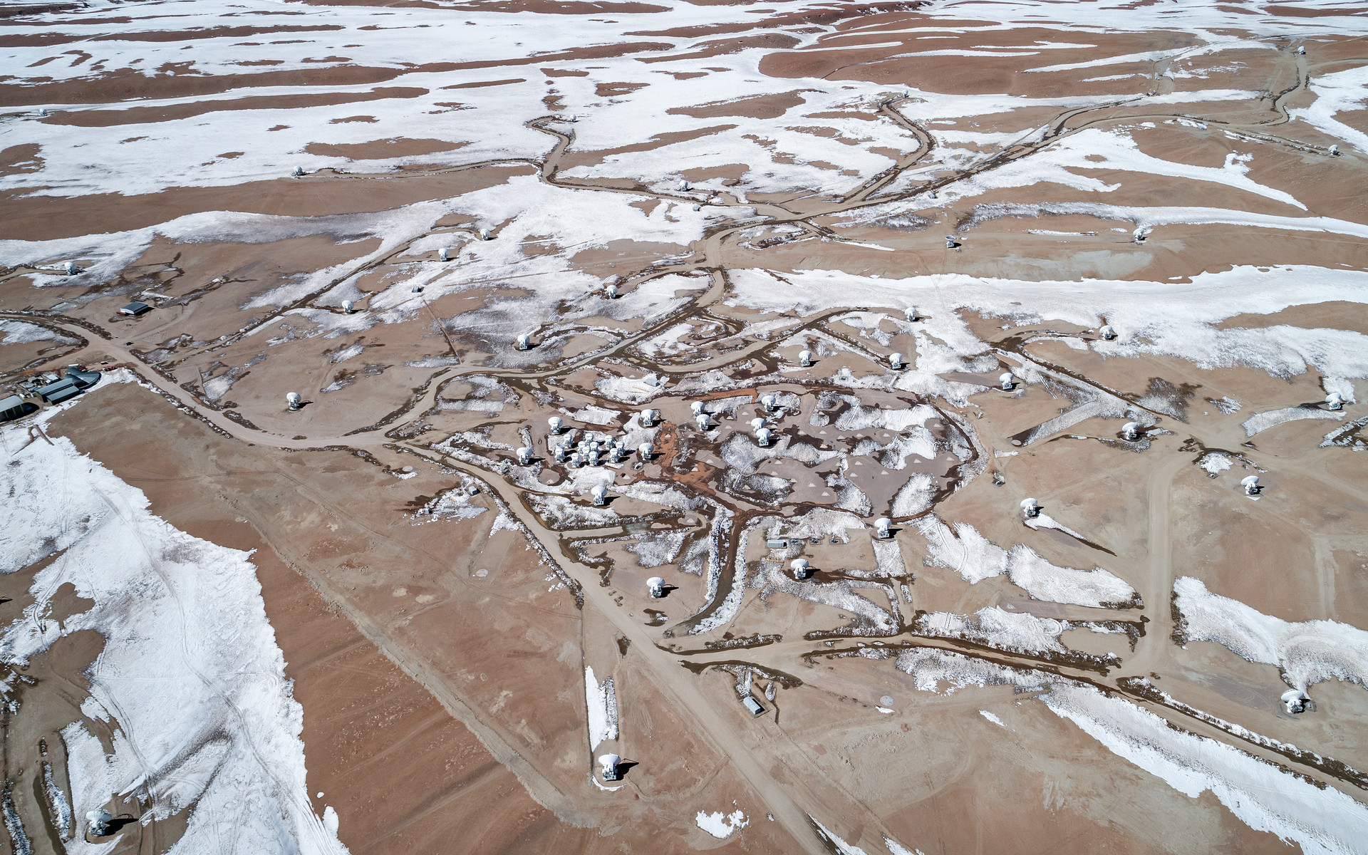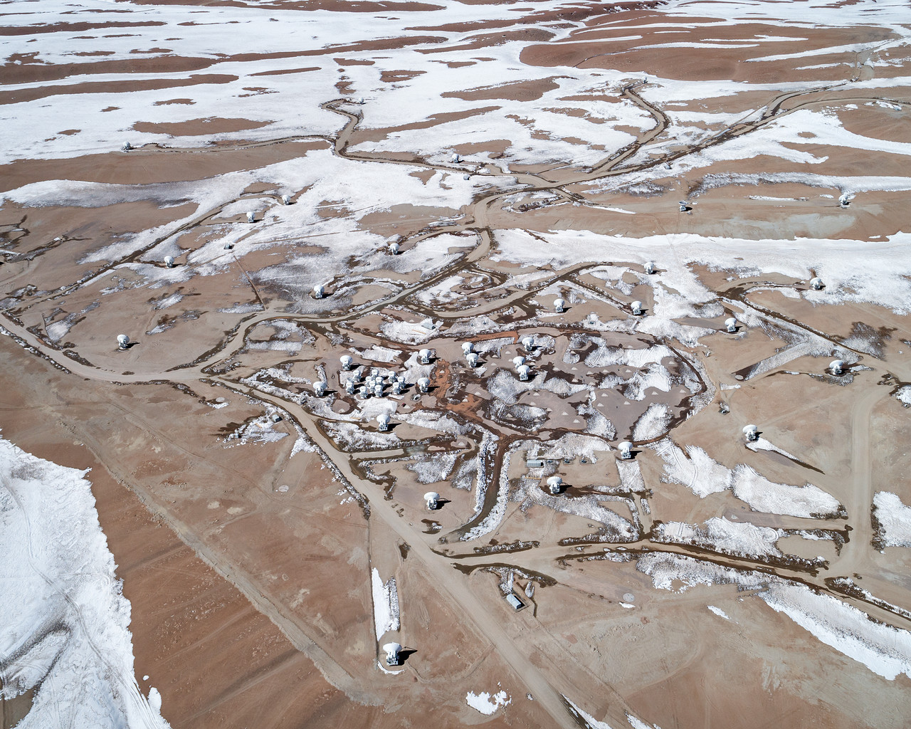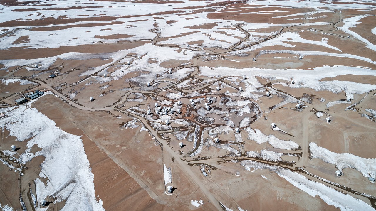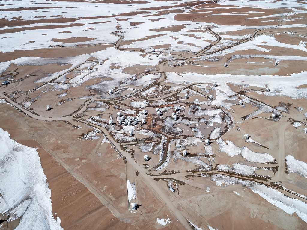 The Atacama Large Millimeter/submillimeter Array (ALMA) stand on the high Chajnantor Plateau of the Chilean Andes, caught in the snow in the middle of winter. This telescope combines smaller antenna moveable put o 16km to "zoom" in on small, far away objects.