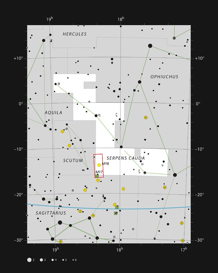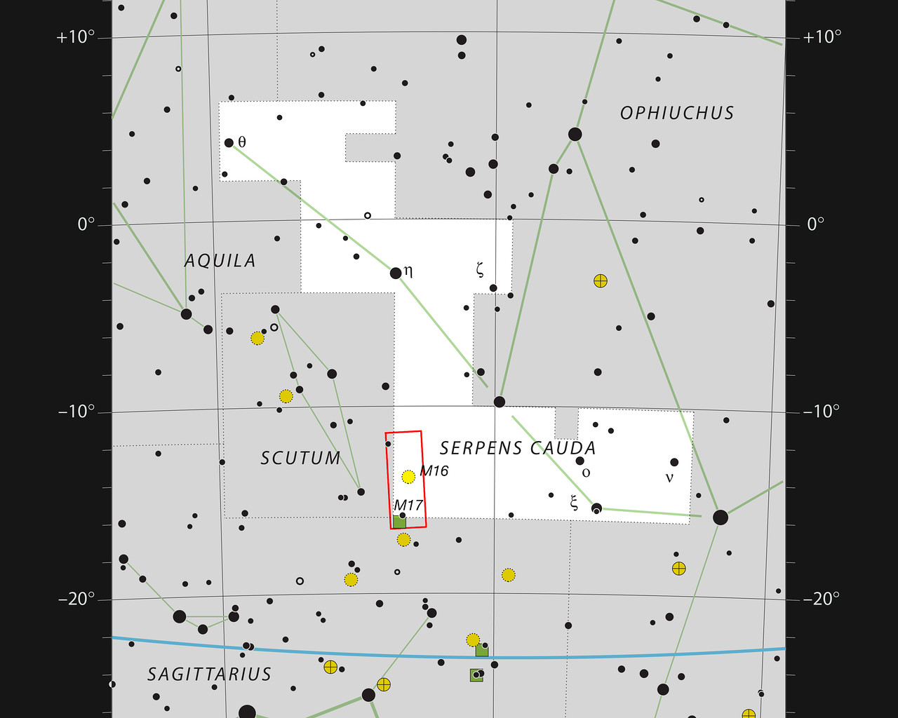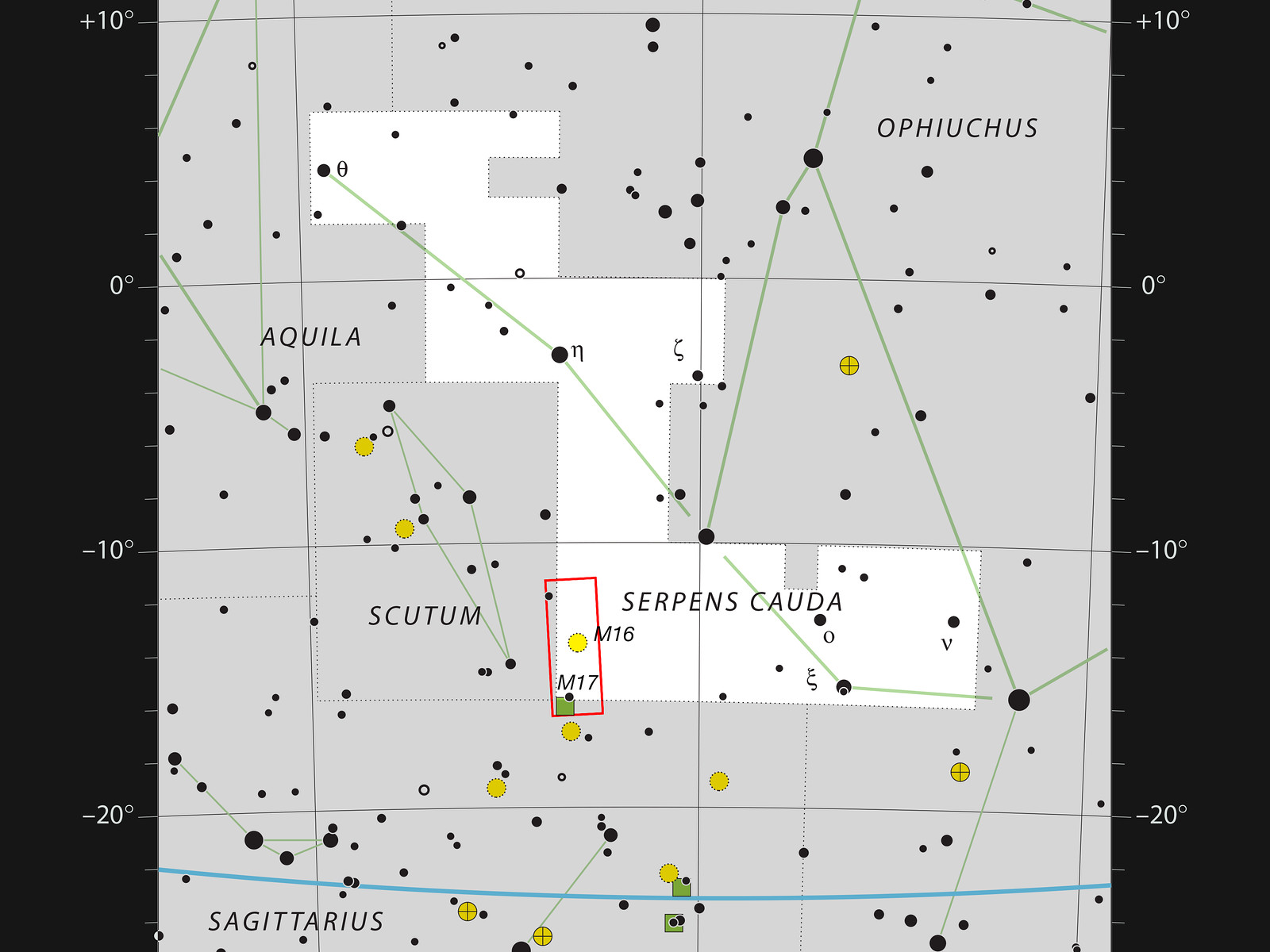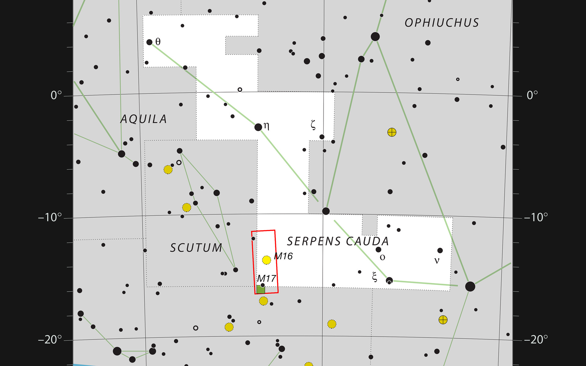Stjernekortet viser stjernebilledet Serpens Cauda - Slangens hale, som er den ene del af det opdelte stjernebillede Serpens (Slangen). Den berømte Ørnetåge, Messier 16 befinder sig i kanten af dette stjernebillede, og dens lige så berømte kollega Omegatågen (Messier 17) er lige på den anden side af grænsebommen til stjernebilledet Skytten (Sagittarius). De gule cirkler betegner stjernehobe, og de grønne firkanter er tåger af støv eller gas.