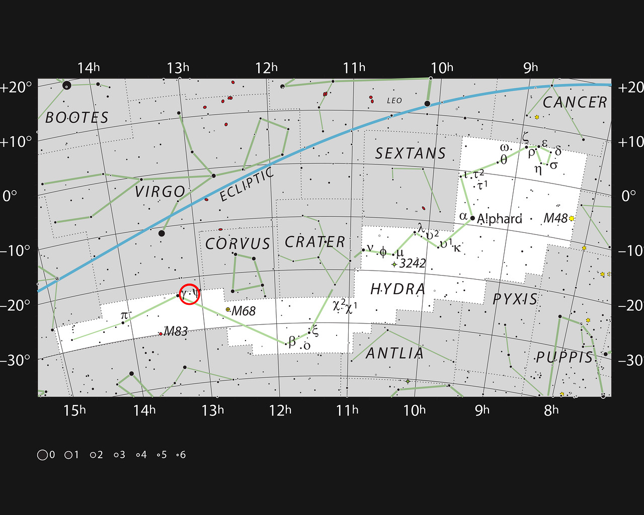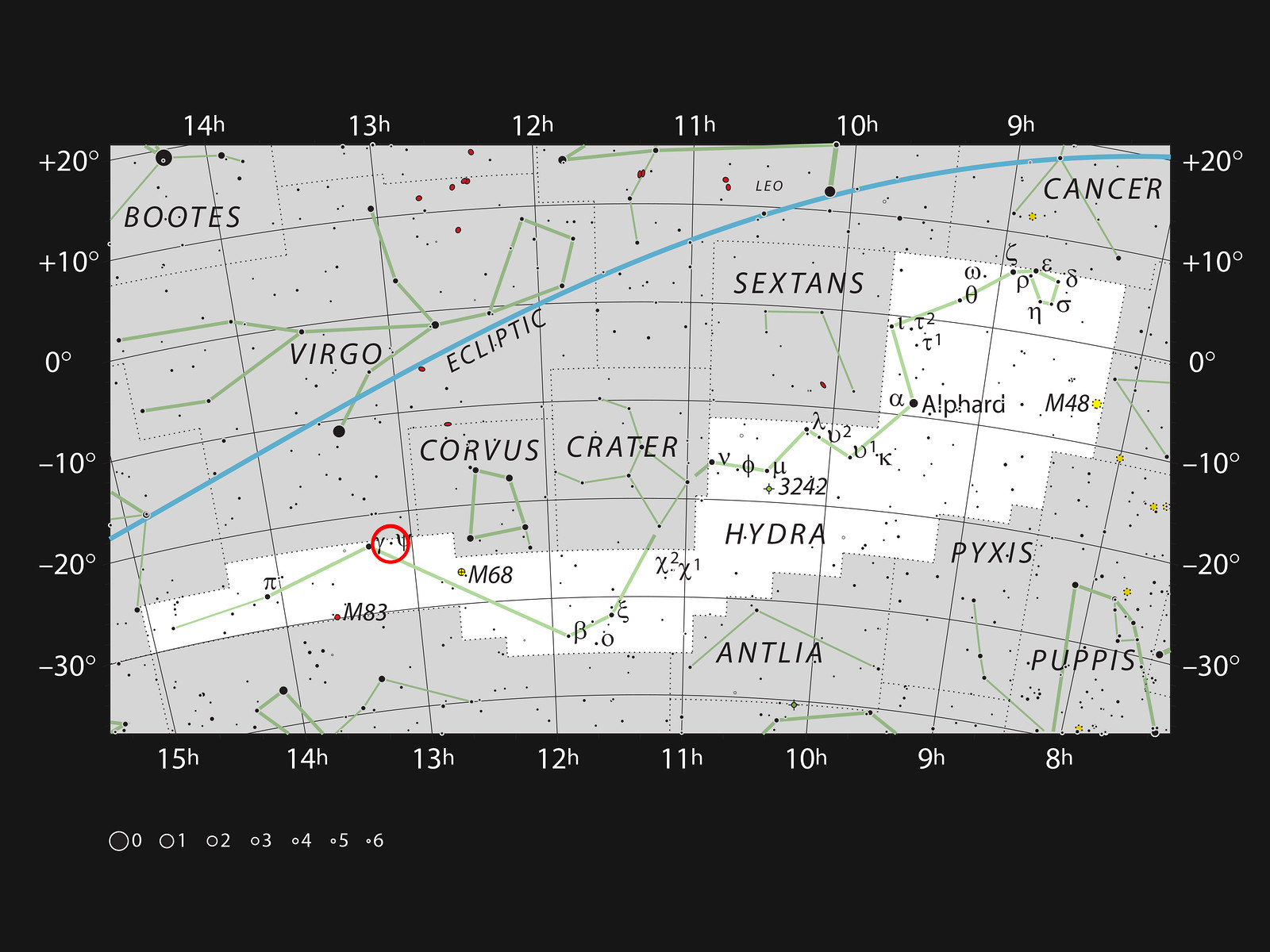 Stjernekortet viser det store stjernbillede Hydra (Den store Havslange). Det er himlens største og længste stjernebillede. De fleste af de stjerner, som man kan se med det blotte øje en mørk og klar nat er med. Den røde cirkel viser, hvor galaksen NGC4993 befinder sig. Galaksen blev særligt kendt i august 2017 fordi der fra den blev udsendt tyngdekraftbølger, som også kunne ses i synligt lys. Objektet kaldes kilonovaen GW170817. I st større amatørteleskop kan man skimte galaksen, men ikke kilonovaen, selv da den var klarest.