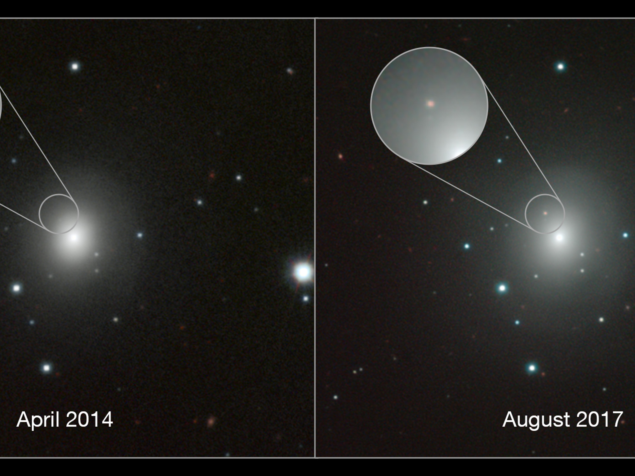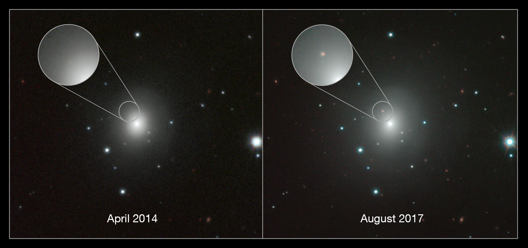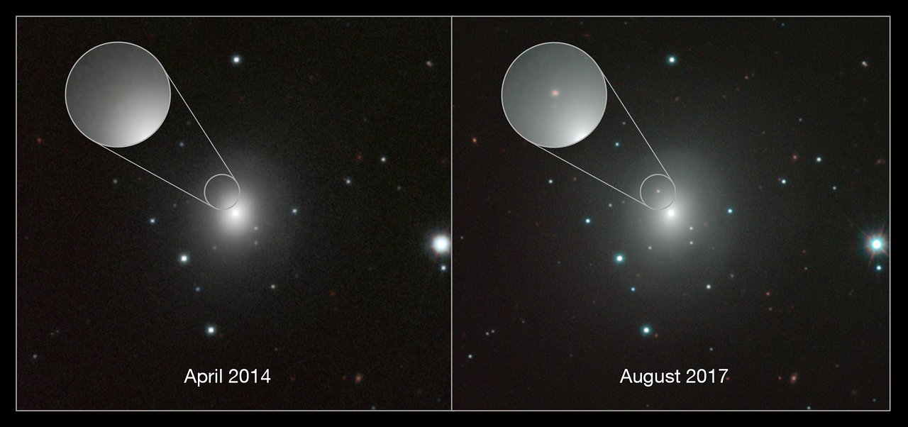 På de to billeder ser man den ret almindelige galakse NGC 4993, 130 millioner lysår fra Jorden før og umiddelbart efter kilonovaeksplosionen